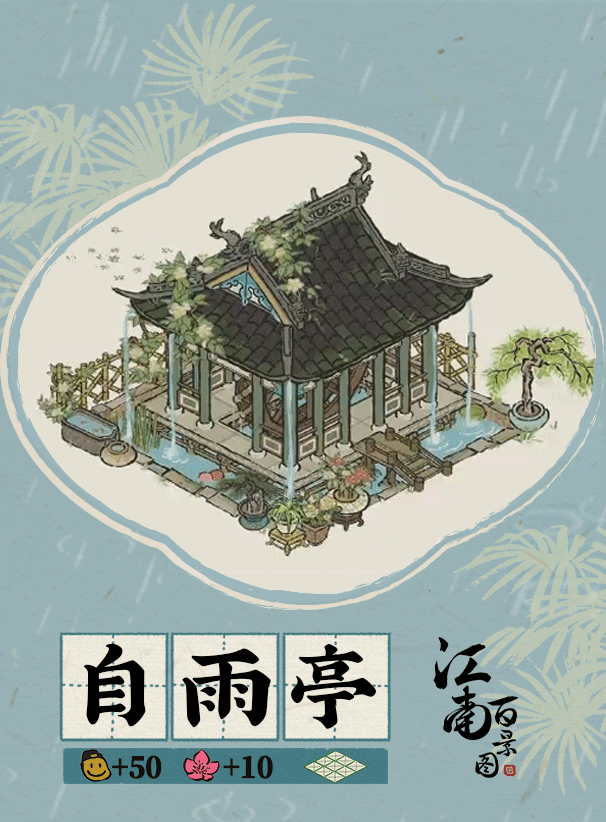 【建筑大小】3*3【建筑回忆】这年的夏来得分外早,花园中的自雨亭早早便派上了用场,水车将园中活水引上亭檐,水流再顺着亭檐流下,带走暑气,别有清凉。阿瑶贪凉,整日待在亭中避暑。午后蝉鸣阵阵,水车轧轧作响,阿瑶不知不觉睡了过去,醒来时,她看见隔着水帘,隔壁的方家哥哥正似笑非笑地瞧着她。「方哥哥!」阿瑶连忙坐起来。「知道你喜欢来这里避暑,便过来看看你。」方家哥哥笑嘻嘻地说,「谁知道,看到了一