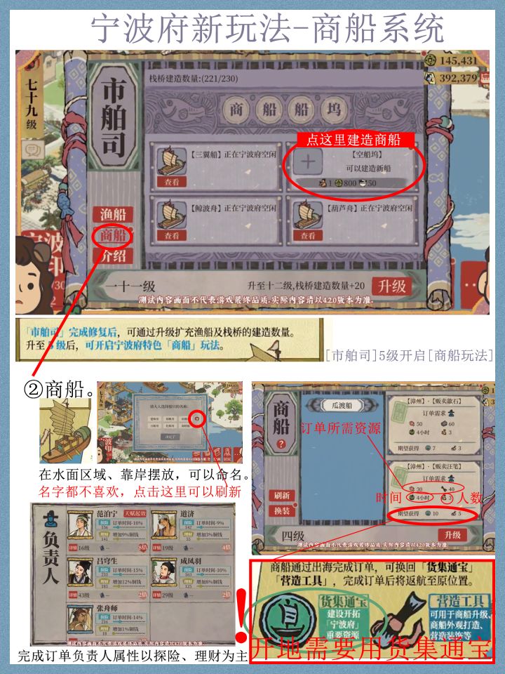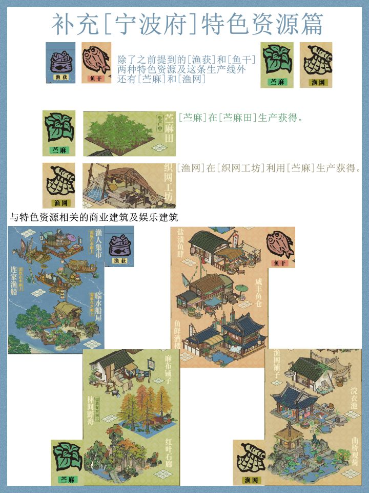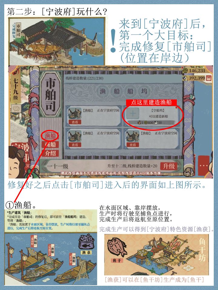 【 宁波府】攻略先行版9.15把直播又回看了一遍,大致上把宁波府的玩法理清楚了,还是比较简单的,初步感觉只在开地时候比较肝资源【货集通宝】,以及后期填仓库的话资源【鱼获】及【鱼干】需要肝一些。地图(详见第7张图)水域面积很大,三块陆地相较其他城市感觉小一些,开地的话因为31级就能来新城市,预估不会太耗铜钱(自然也不是很赚钱?)总体来说,玩法很常规,都带点杭州商栈,徽州徽商和老字号,扬州漕运的