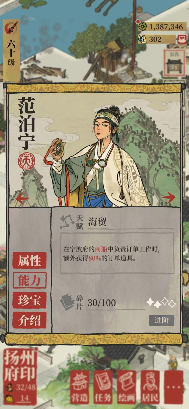 宁波府的开启可谓是普天同庆,老玩家们携带着脱坑前存下的大量物资和无限加速票回归啦,那如何最快的开完宁波所有的地呢? 首先不惜一切代价抽出范泊宁,他是宁波专属天级人物,天赋是跑商船道具获取量+80%,不过,由于宁波的商船玩法产出的铜板太少,所以不必执着抽专珍。老范的珍宝首推满级的八景宫灯,这样跑商船的时间可以达到-80%。特别提醒,晚上的满阶蓝玉的天赋在商船这是不生效的,多么痛的教训… 宁波府所