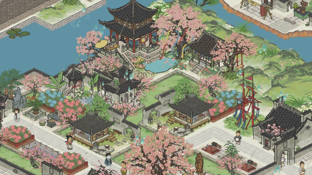 扬州府华枝边+汶河边布局 建筑:碧水楼台,临溪亭,闲云水榭,放鸢池,退而结网,棋盘闲居,疏食菜畦,春日踏青 #江南百景图 #江南百景图布局 #江南百景图扬州府