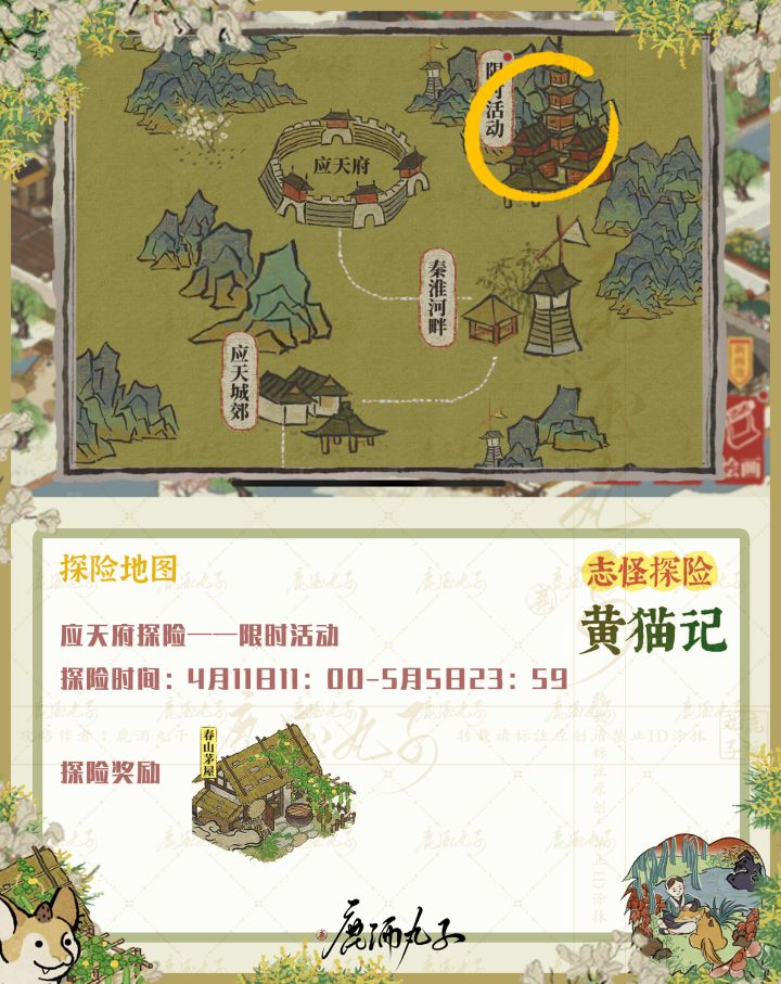 🌛应天城外一山村,村人长寿多志怪。☁4月11日11:00起,江南百景图正式开启全新志怪探险之「黄猫记」!☁前往「应天府-驿站」消耗粮草前往地图上标记为「限时活动」的地点,跟随泉先一同探寻长寿村的秘密!⭐完成志怪探险任务后,知府大人可将全新2*2建筑「春山茅屋」收入囊中!#江南百景图#江南百景图探险