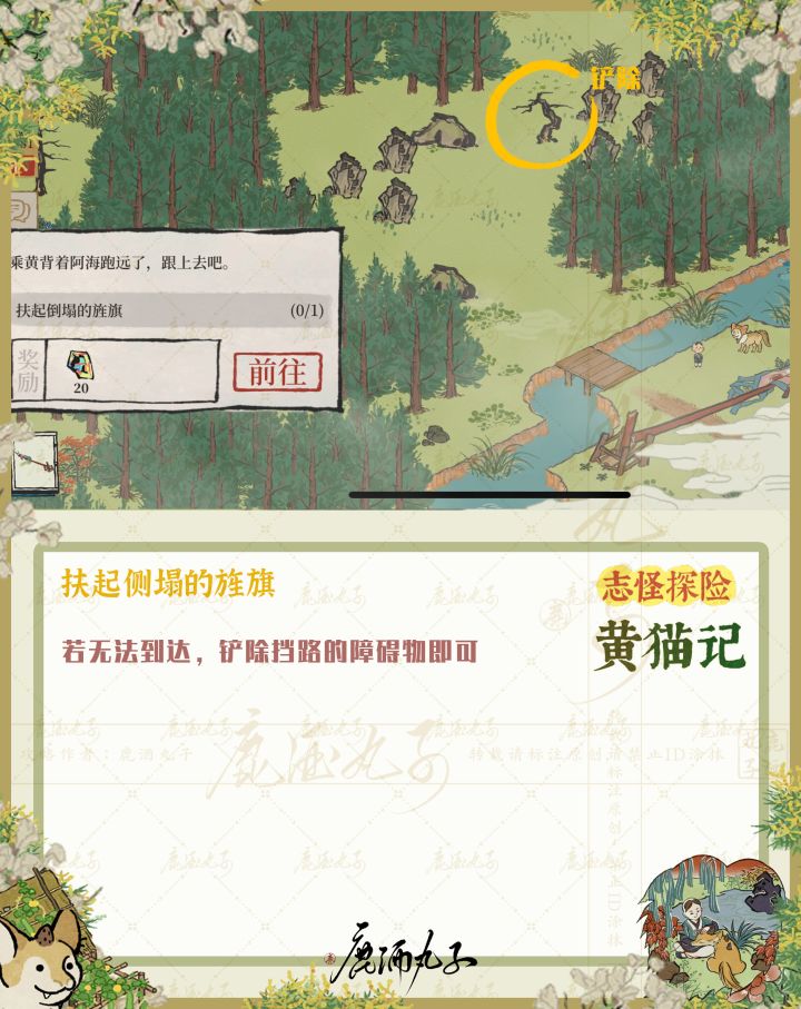 🌿图1-探险地图🌸应天府探险——限时活动🌸探险时间:4月11日11:00-5月5日23:59🌸探险奖励:春山茅屋🌿图2-制作一个猫猫头套🌸探索[森林废墟]获得工作台材料🌿图3-扶起侧塌的旌旗🌸若无法到达,铲除挡路的障碍物即可🌿图4-移除桥边巨石🌸若无法到达,铲除挡路的障碍物即可🌿图5-疏通水井🌸若无法到达,铲除挡路的障碍物即可🌿图6-去码头钓鱼🌸鱼饵通过采集[蚯蚓]获得🌸