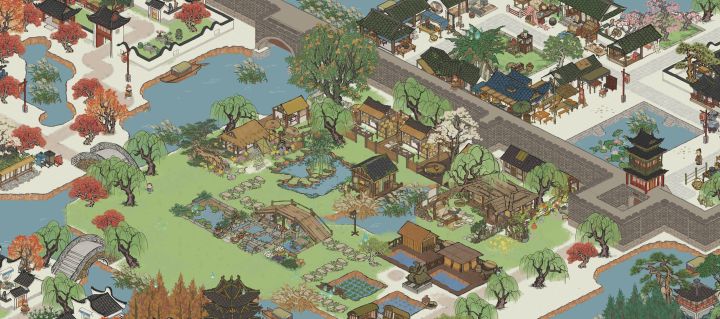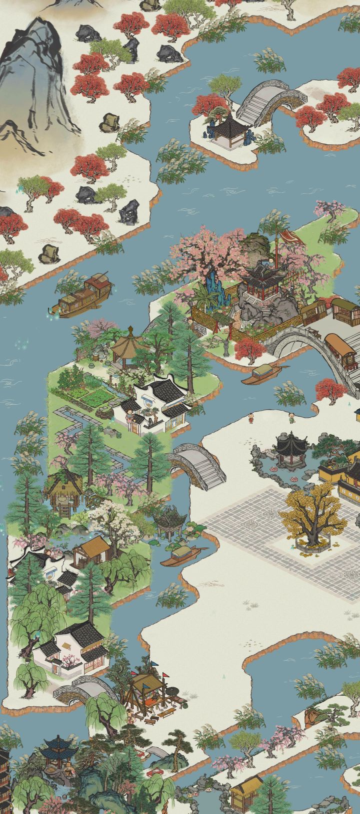 建筑:碧海付导、纹砧捣衣、弄水轩、小桥流水、溪畔悠悠、兰墙、漆树林、春园小径、芭蕉洞、不老山、伏鹿山、枫杨树、林中白桦、芭蕉庭院、绿蚁新酒#江南百景图 #游戏种草计划 #江南百景图苏州府布局
