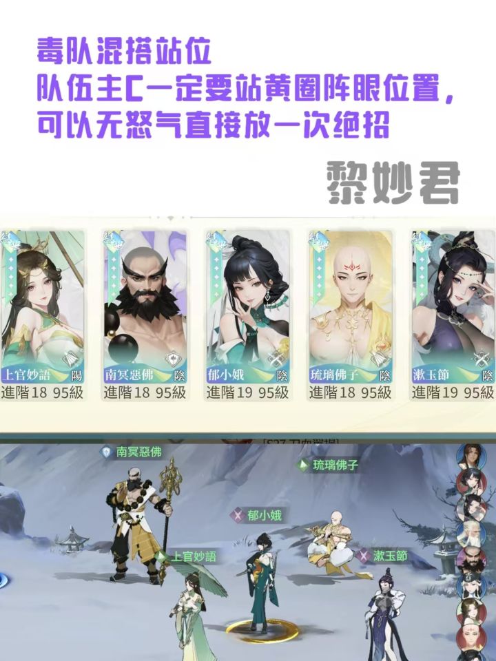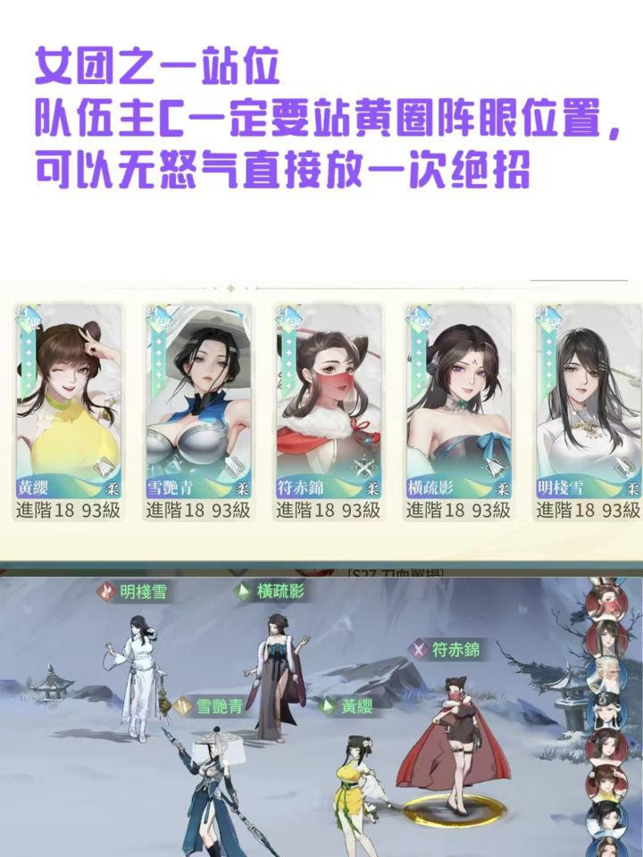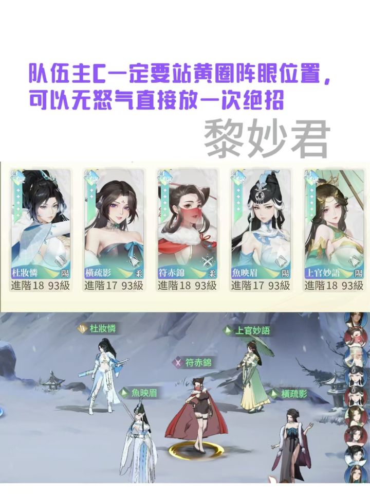 阵容推荐杜妆怜,鱼映眉,聂雨色,也就是鱼杜聂,而且只需要养三张卡,这对新手,平民,微氪玩家非常舒服,不需要太多资源养,刚好符合三个心愿现在刚好出了新的sp入圣侠客柳梦碟,加上送的黄缨,一个,非常舒服又强势的阵容,组成了优先把杜妆怜养到绝5,(这时心愿招募空出来一个位置,可以养一个盾 元少眉挡爆发当前排,或者许緇衣当二队,或者人权辅助卡叶幔色配合许緇衣) 杜彩5之后,再将鱼养彩2(鱼可以靠心