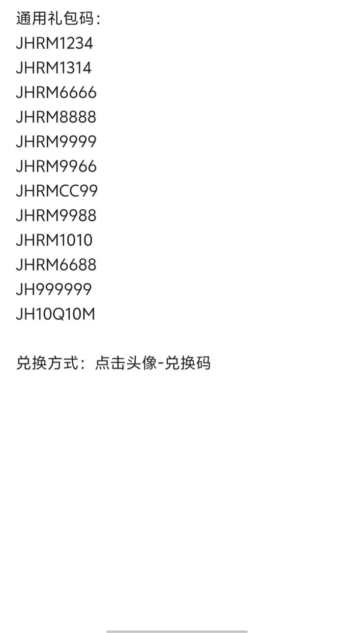 都是有顺序的,看着输入就可以我也给复制出来了JHRM1234JHRM1314JHRM6666JHRM8888JHRM9999JHRM9966JHRMCC99JHRM9988JHRM1010JHRM6688JH999999JH10Q10M#江湖如梦 #江湖如梦兑换码 #游戏推荐
