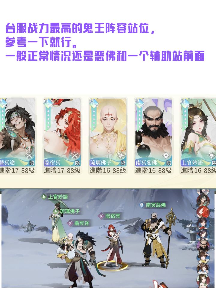 参考一下,鬼王那个站位,正常还是恶佛前排哦,不要无脑照搬,等会我会发一个单独鬼王阵容的攻略帖子。#江湖如梦