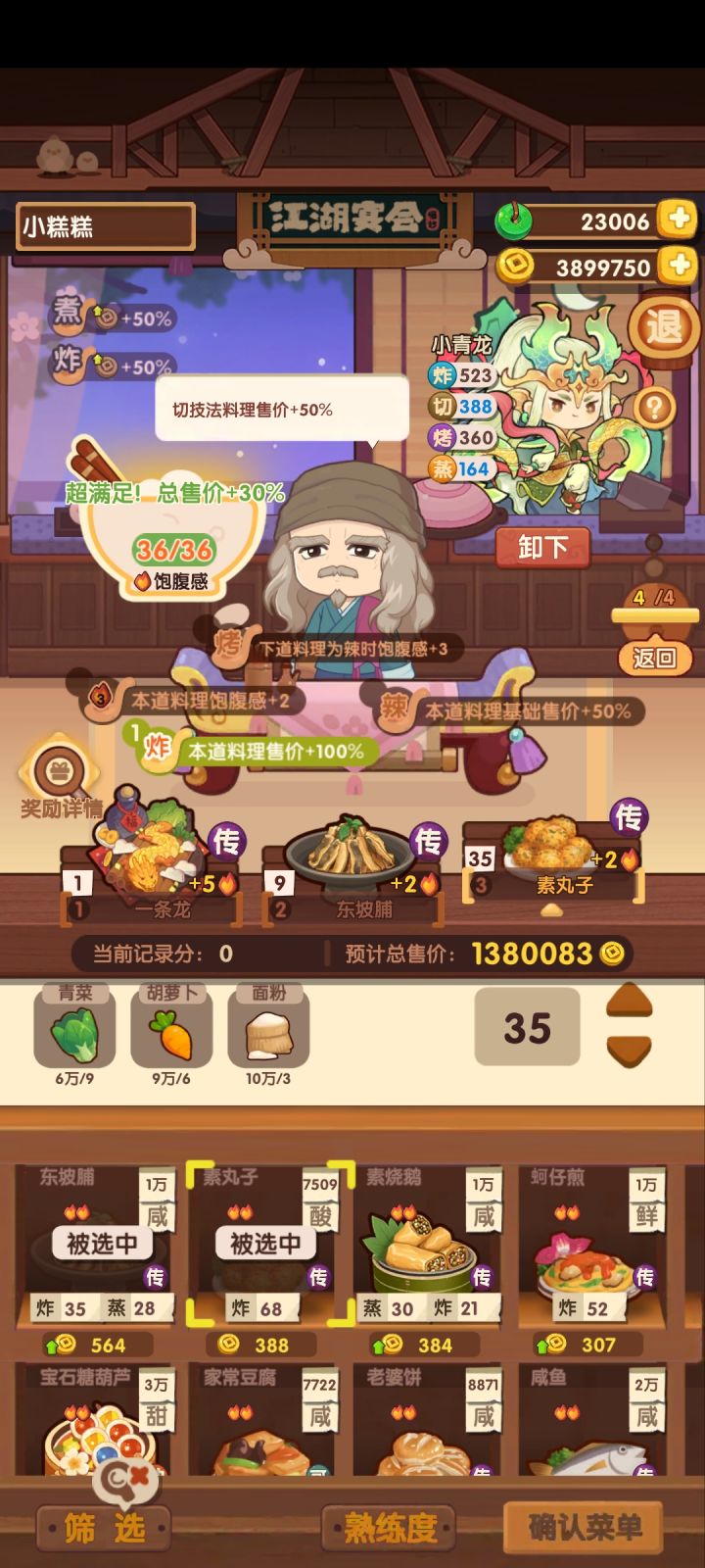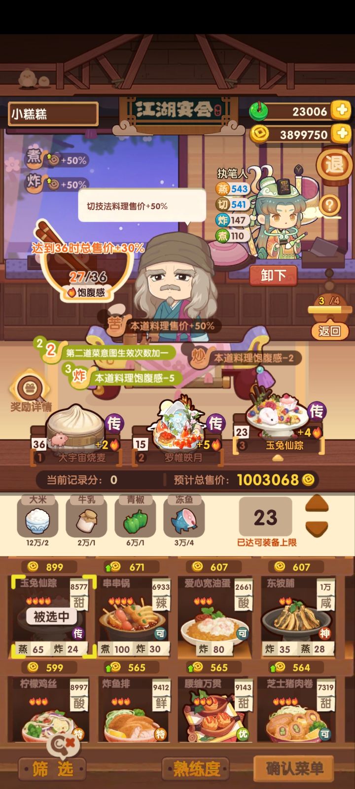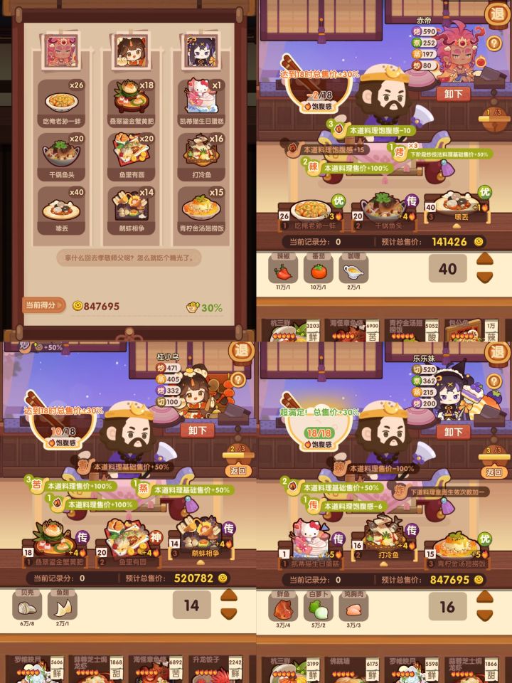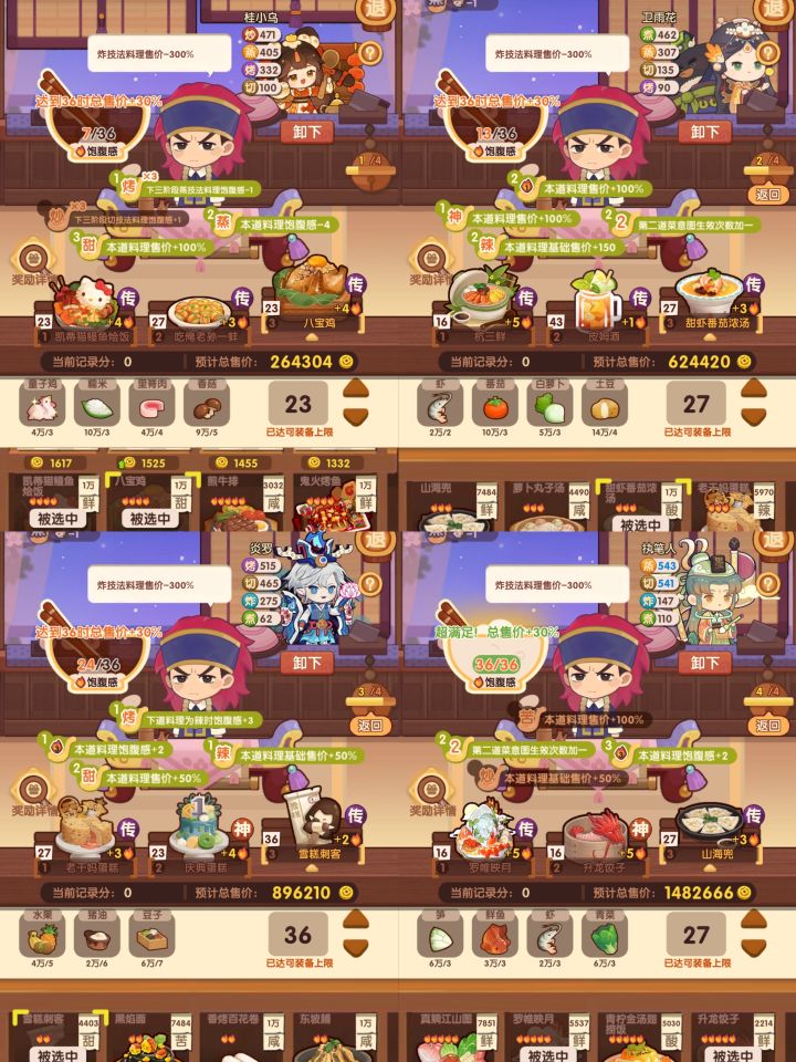 第一轮挑选蒸炒厨,达成除了炒x3外所有的条件。第二轮挑选蒸煮厨,务必将一个传奇技法的1火料理,比如皮姆酒 放在第二栏。第三轮挑选烤切厨,将辣味烤技料理放在第一个位置,以免占用过多饱腹感。第四轮挑选蒸切厨,注意第二个位置放总售价最高的传奇料理。#江湖宴会 #爆炒江湖 #爆炒江湖七周年快乐