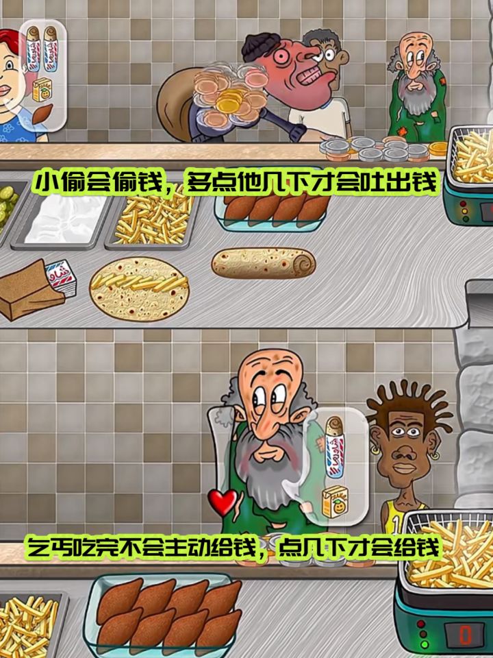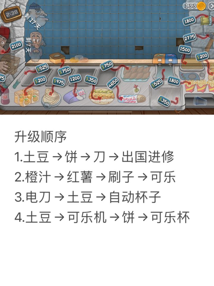 升级顺序建议:⭐优先升级员工老头:花费2100金币,可实现酸黄瓜、沙拉酱、橙汁、番薯自动化补充,性价比很高,⭐烤肉管、卷饼皮、包装机、削土豆三个同时升级,攒够钱能升哪个升哪个【优先级为卷饼皮+包装机二级>烤肉>削土豆>卷饼皮包装机满级。】【升级食材需要点击的次数也很重要,从3次到2次到1次】⭐添加橙汁和大番薯:这两个都是不需要升级就可以由员工自动补充的⭐装修餐厅和店面扩张:可以在一轮升