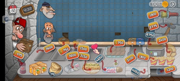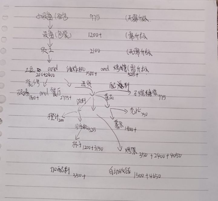更快削土豆--沙威玛配料(点两下)--双面烤肉刀--自动饼皮机器--包装机器--炸土豆机器--小偷警报器--修理破墙--自动切土豆--自动切烤肉--店员培训--橙汁--烤红薯--【可乐机--自动杯子--杯子自动灌装可乐】(约花费5000)--四个座位--更快的可乐机--无视小偷加自动收钱--沙威玛配料(点一下)--自动包装机器--自动炸薯条机器--最好的可乐机--【烤盘--自动烤盘--更好的烤盘】
