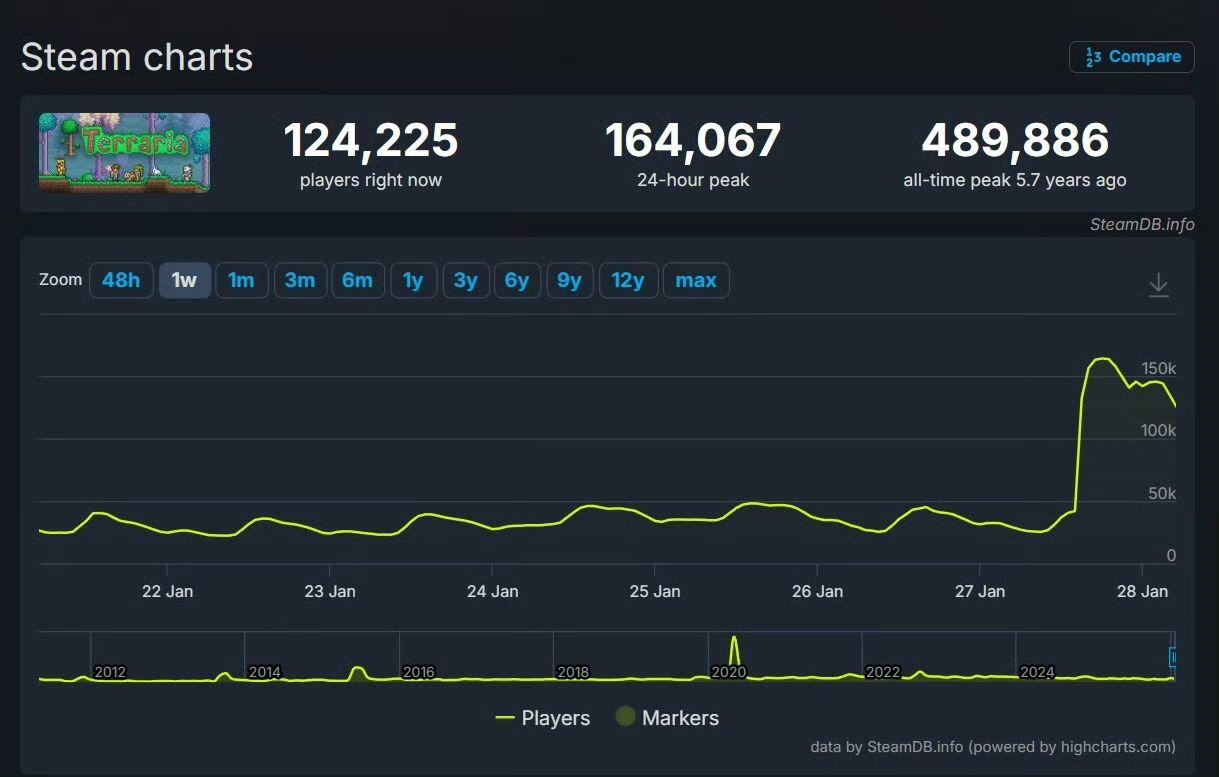 1月27日,开发商Re-Logic宣布传奇沙盒游戏《泰拉瑞亚》1.4.5版本“Bigger&Boulder”正式上线,Steam平台24小时同时在线峰值达16.4万,当前在线玩家数量稳定在12万左右,创下近6年最高在线纪录。本次更新是游戏近年来规模最大的版本之一,作为15周年纪念内容的重要组成部分,新增超650种物品,包括与《死亡细胞》《幻兽帕鲁》的跨界联动内容,涵盖专属武器、时装、可召唤功能随