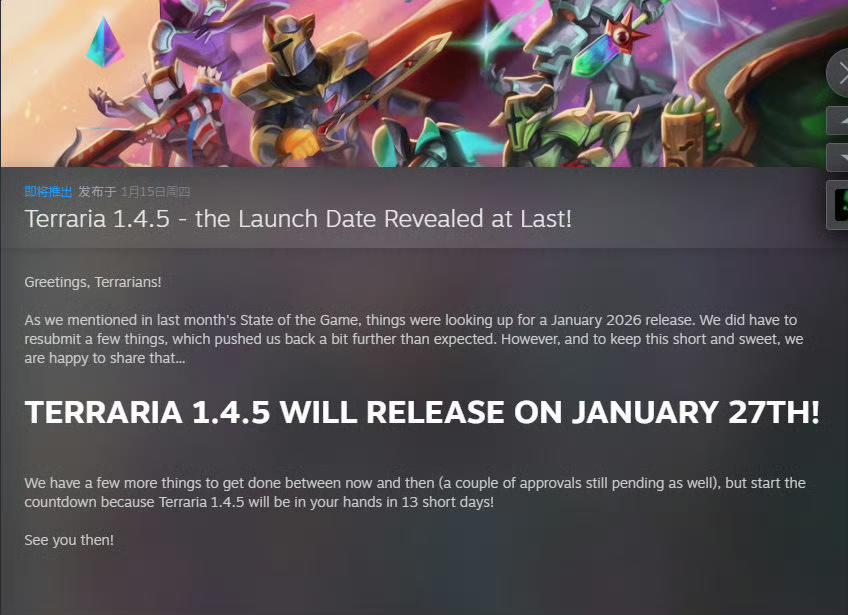 Re-Logic 官方正式官宣,沙盒神作《泰拉瑞亚》1.4.5版本将于1月27日全平台同步上线,引发全球玩家狂欢。官方透露,目前版本开发已基本完成,仅剩少量收尾工作及几项平台审批待提交。“从现在到正式发布还有一些事要推进,但大家可以开始倒数了,13天后1.4.5版本就会和大家见面!” 简短话语满是期待,让等待已久的玩家兴奋不已。#主机单机 #泰拉瑞亚 #泰拉瑞亚多人游戏