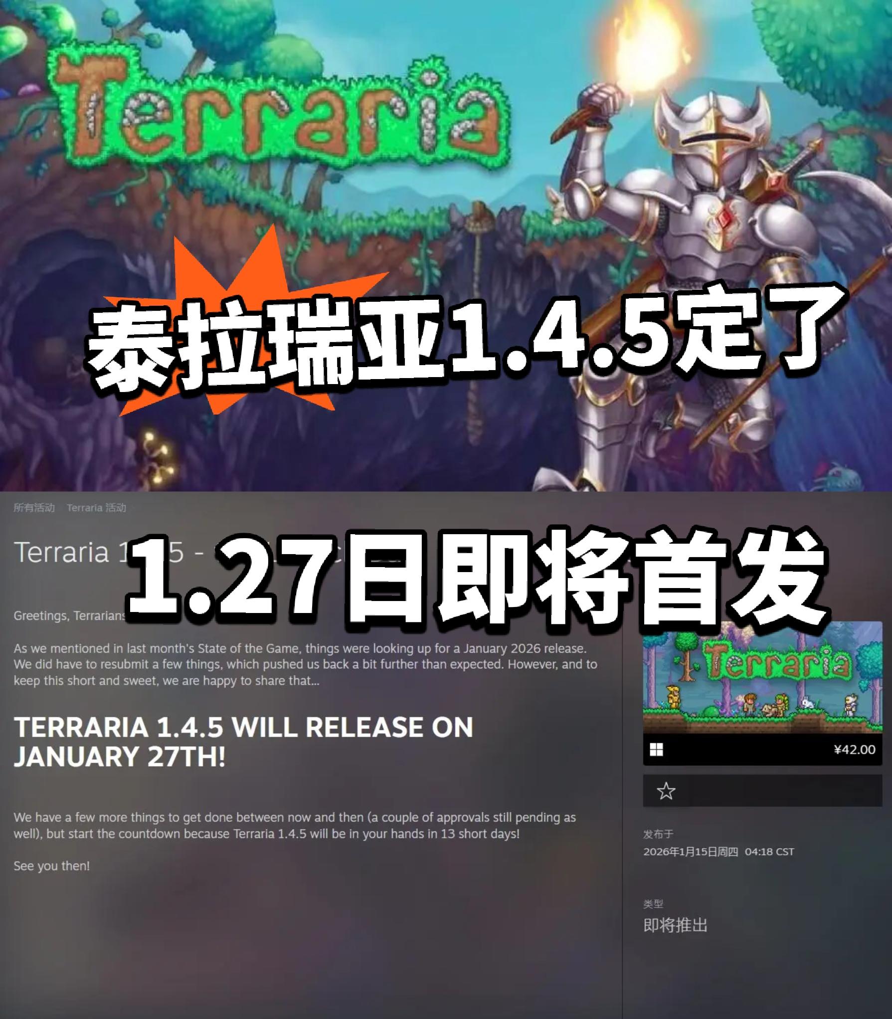 大的来了家人们!就在刚刚 泰拉瑞亚官方正式宣布1.4.5版本将于本月1.27日正式开启!官方表示敬请期待,目前还在加班加点完善当中,一起开始倒数吧#主机单机 #泰拉瑞亚