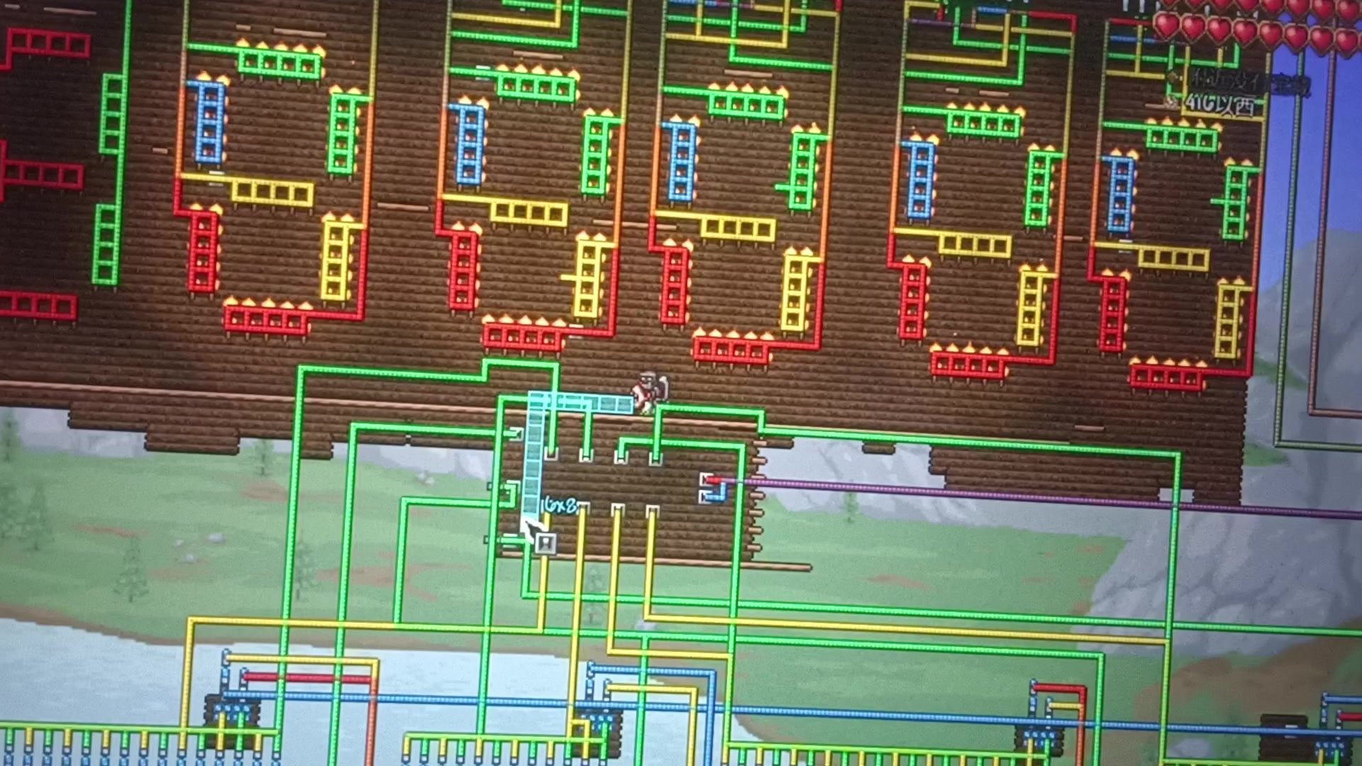 熬夜施工最喜欢也是最讨厌的环节——布线 我敢说拉电线绝对比摆逻辑门还要费精力,逻辑门只需要摆两三个就好了,但布置附近的电线要考虑的就多了 分线盒也是个茬儿,平时看着不起眼,实际上老大堆串线bug都是这玩意忘摆了,归根结底还是电线颜色重叠导致根本看不出来叠了什么 (为什么泰拉只有四种颜色的线啊?多做一条出来真的很难吗?) 好在现在,这件毛衣的无限扩张已经结束了,第一阶段场地的电路部分已经达到98%的