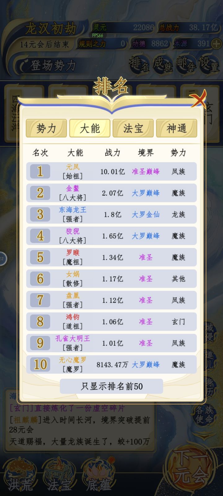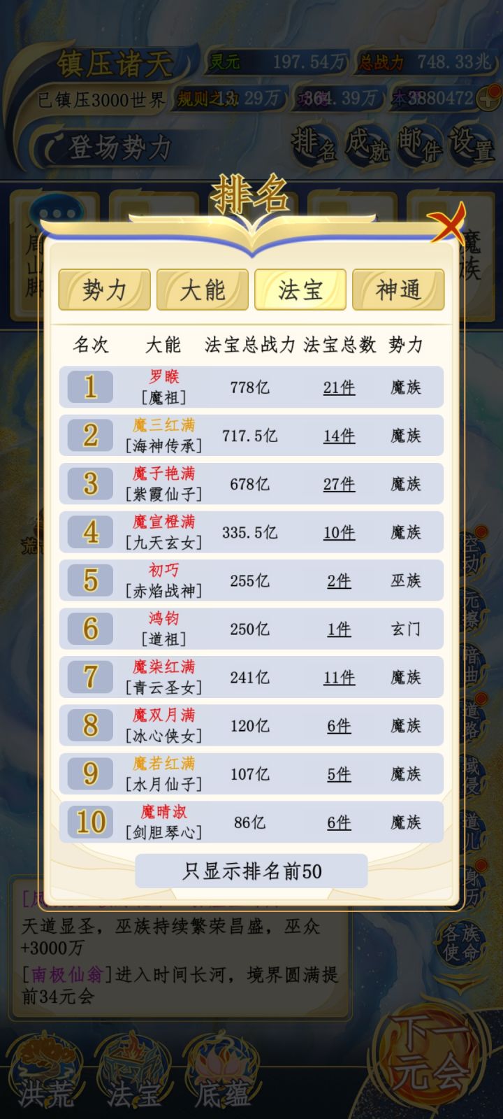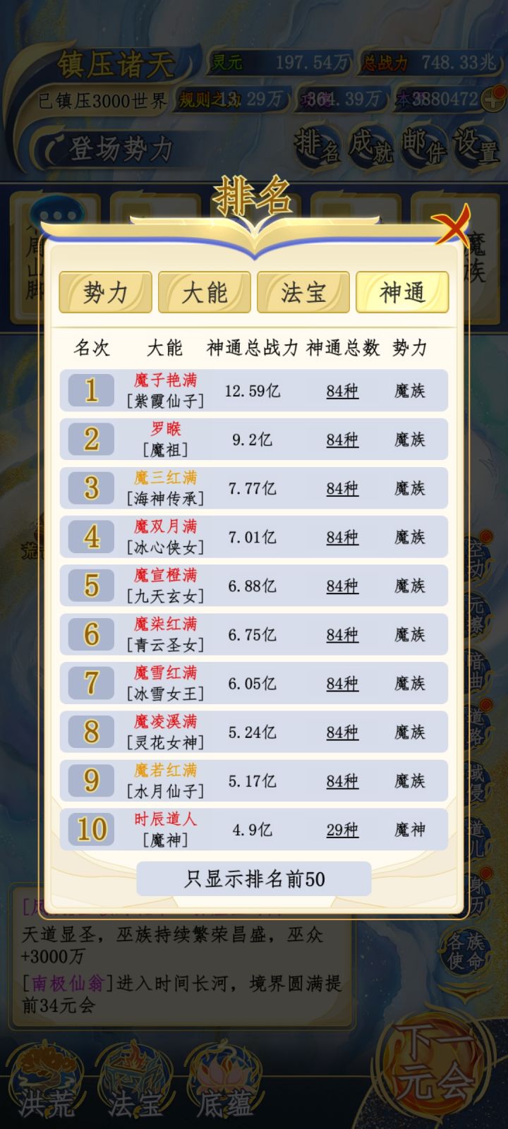 第一阶段龙族3人x34.5战力凤族4人x34.5战力麒麟4人x31.5战力魔族13人x 53.5战力玄门8人x41.5战力其他13人x61.5战力第二阶段巫族11人x39战力妖族5人x41.5战力最后阶段人族12人x41.5战力人教4人x28.5战力阐教18人x32.5战力截教9人x40.5战力天庭4人x38.5战力地府2人x34.5战力#洪荒天道2主宰 阿修罗9