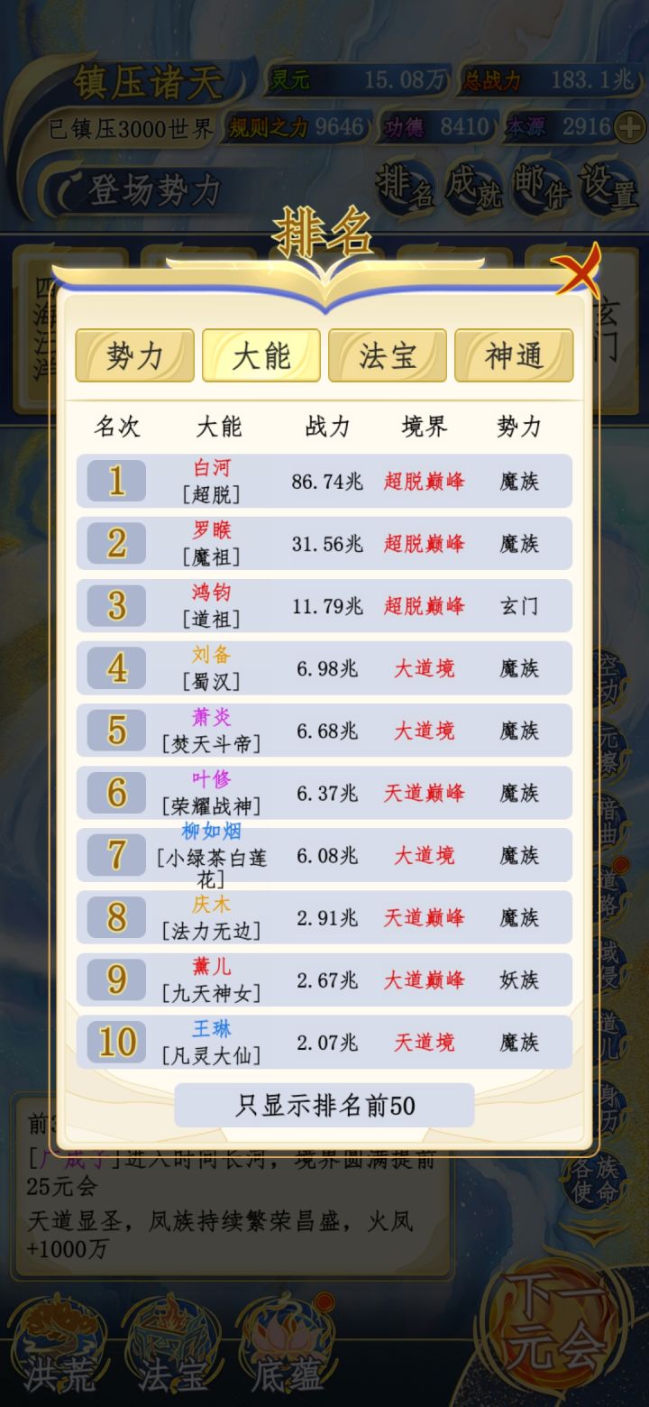 跳!魔族一堆圣人,别的势力都只有一个圣人,魔族可以说是无敌了,一个天道境的罗喉,四大魔罗全是圣人,魔将两个圣人六个准圣巅峰即将圆满,帅呆了#洪荒天道2主宰