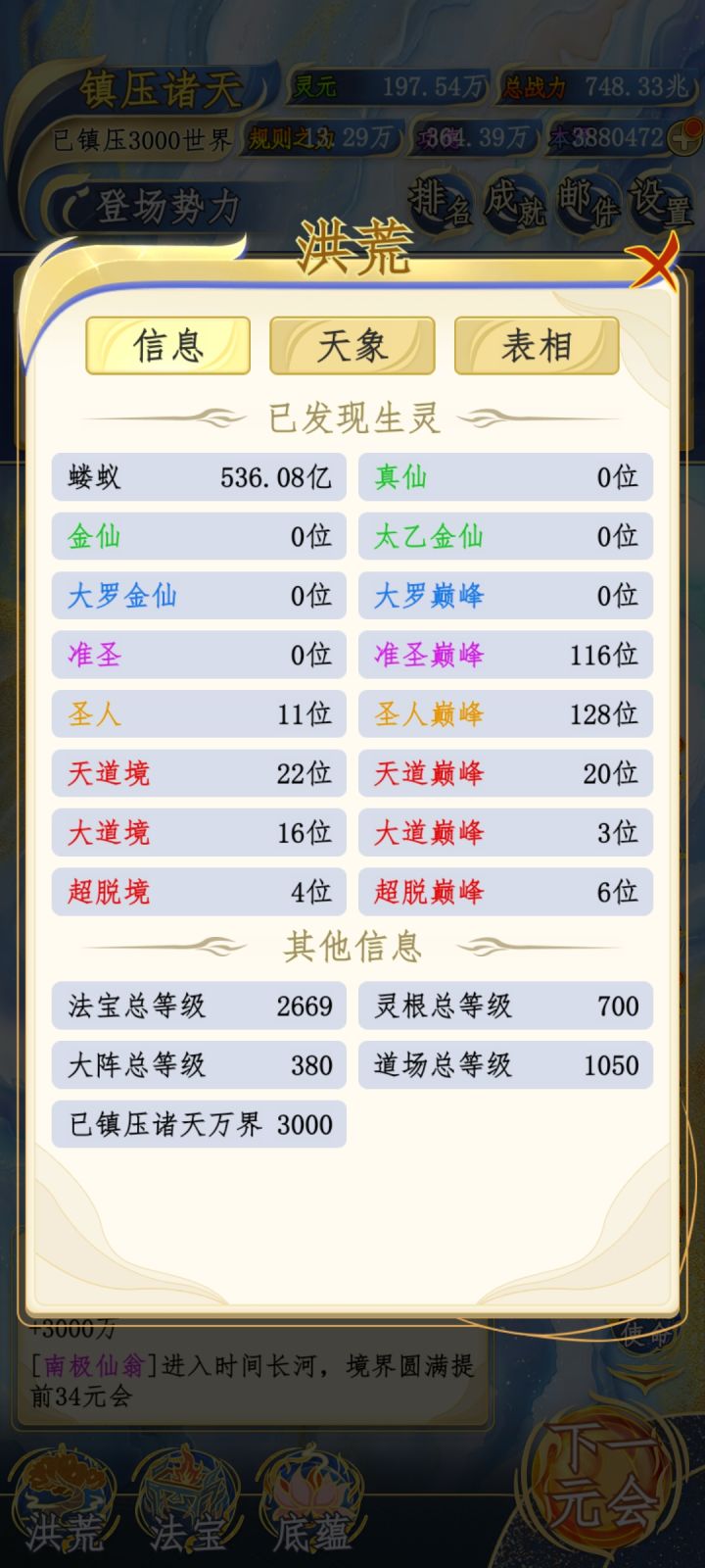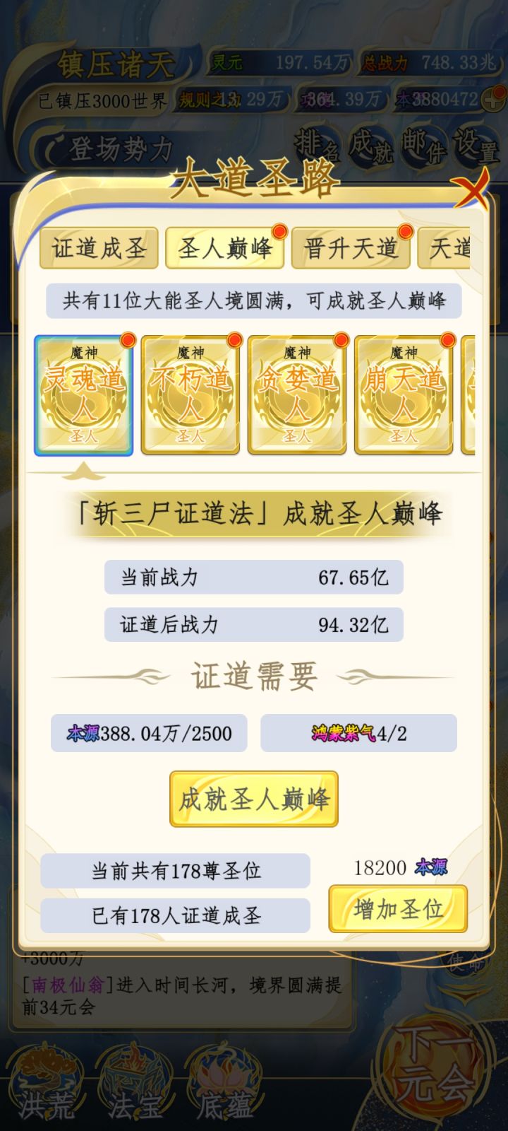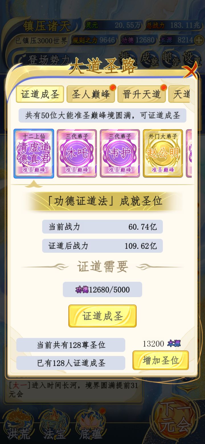 现在890元会,128圣位,说实话本源还好点,再有个八十万左右本源就能全员圣人,最多到1200元会左右就能完成。但是!紫气我大概算了一下,一个人要35到超脱巅峰,能成圣的加上魔神大概200来个,也就是说,最少最少要7000多个紫气才能全员超脱巅峰,这样来算我才完成了百分之五的紫气收集。累了,毁灭吧,赶紧的。#洪荒天道2主宰