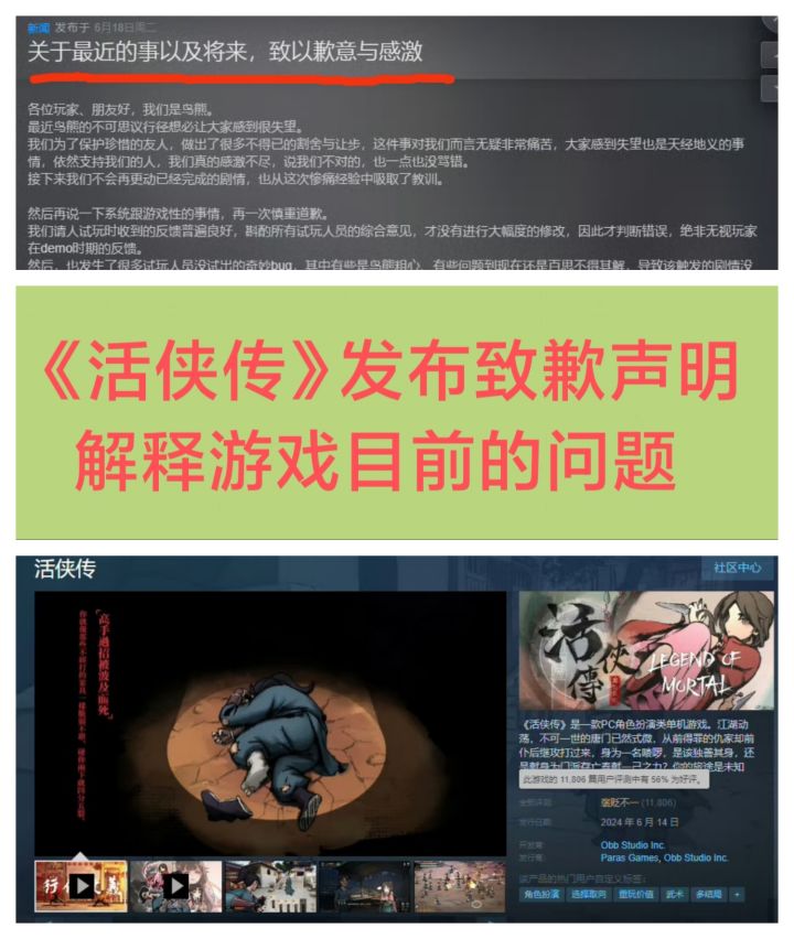 国产游戏《活侠传》因机制等方面问题,被玩家疯狂诟病,如今评价是“褒贬不一”今天6/18,官方发布致歉声明,表示不会再更改已经完成的剧情,并对游戏目前出现的质量问题做了解释。“团队请人试玩时收到的反馈普遍良好,斟酌所有试玩人员的综合意见,才没有进行大幅度的修改,因此才判断错误”“也发生了很多试玩人员没试出的奇妙