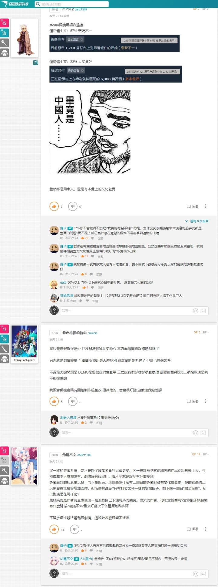 活侠传是最近b站在发布之前一片好评的国产单机游戏,然而在发售后,却因为作者的文青病+恶意游戏系统+后半段空降龙傲天加打赢龙傲天后会被强制天雷电死+不追求小师妹的话,会看到小师妹在龙傲天的后宫之中担忧龙傲天,所以引发两岸玩家一致声讨。目前台湾褒贬不一,大陆多半差评。有人指出中台文化差异却被台湾玩家批驳,你想赚大陆的钱就应该接受大陆的市场检验。更有湾湾持续发文批驳,目前作者已被迫在推特关闭评论区