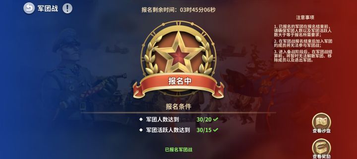 尊敬的统帅:本周「军团战」报名阶段即将于今晚24:00截止,请您合理安排游戏时间,不要错过活动呦!温馨提示:· 还未加入军团的统帅可点击【军团】按钮或【军团要塞】加入军团。· 报名「军团战」需军团人数达到20人、军团活跃人数达到15人,满足报名条件的军团可通过军团长进行报名(可主动取消报名)。· 已报名的军团在报名结束前,请确保军团人数和军团活跃人数大于等于报名要求。· 在报名阶段结束