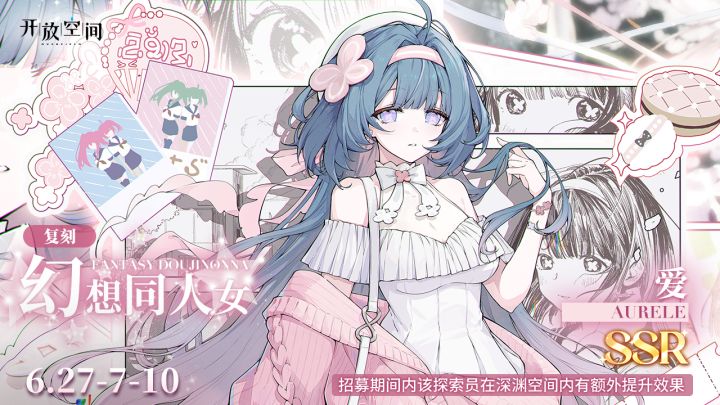 "冒险开始,标题是:浪漫空间少女与命运邂逅。"SSR探索员「幻想同人女-爱」复刻登场,获取概率大幅提高!请队长不要错过哦! ✦招募开放时间✦2025年6月27日维护更新后 - 7月10日23:59 ✦招募说明✦*活动期间,SSR探索员「爱」的获取概率大幅提高,每10次招募必得SR探索员。*每70次招募必出当期UP角色!(出其它 SSR 角色,保底不清空)*招募期间内该探索员在深渊空间