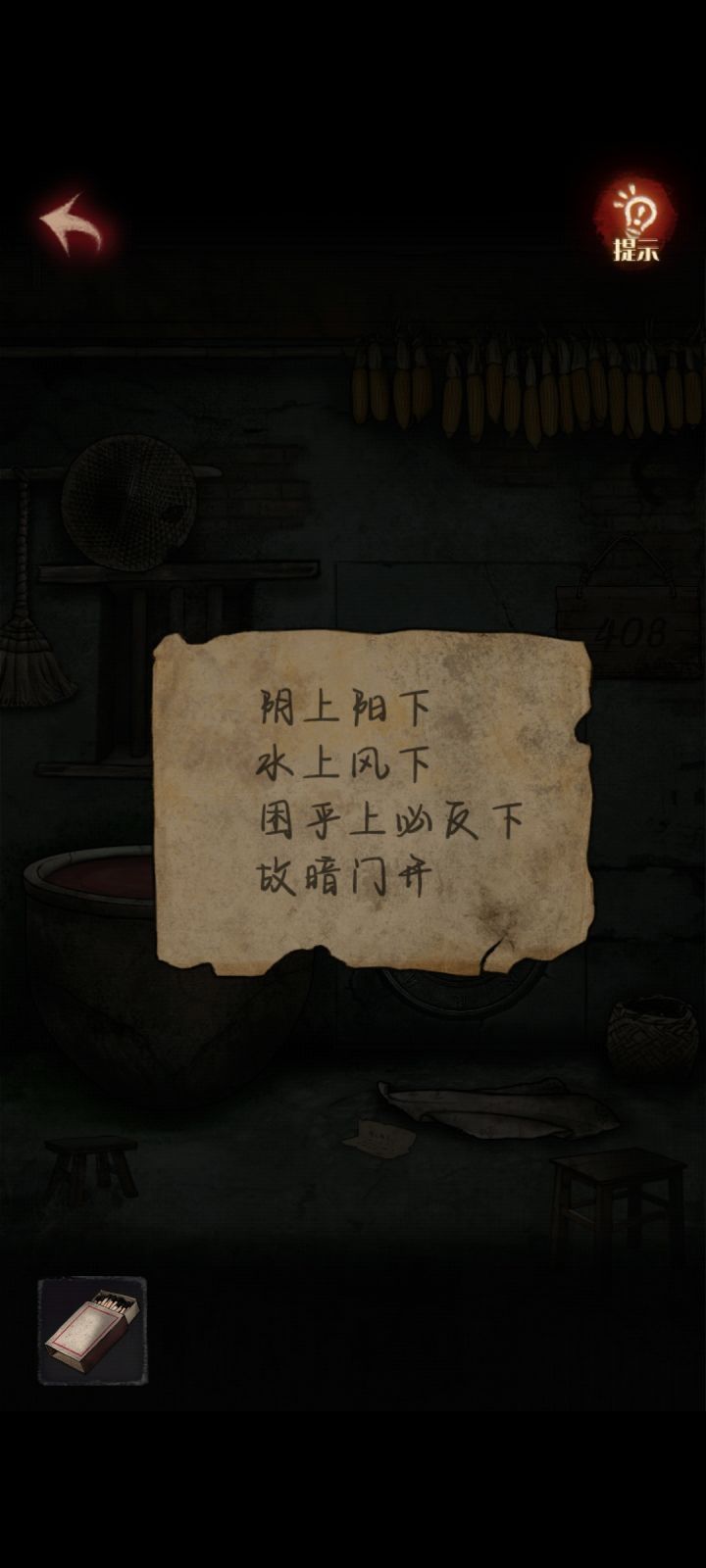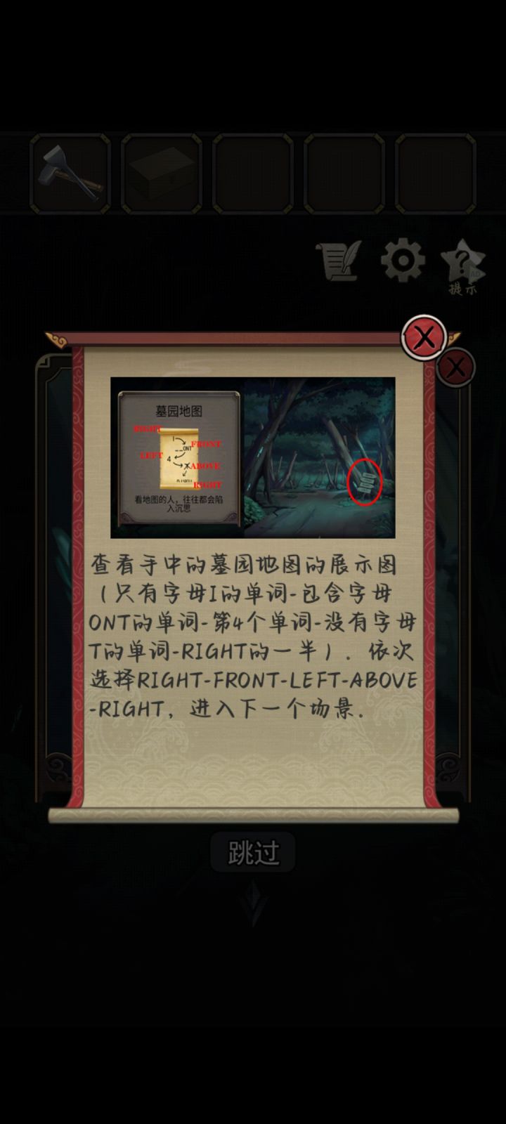 ||||||第一章1.(祠堂)点击拾取台子上的【火柴盒】2.点击供桌,用【火柴盒】点燃蜡烛;点击查看碗底的图案3.点击查看地上的羊皮纸内容4.点击倒下的凳子,获得【创可贴】5.点击墙上的挂画,按下旁边的按钮,收起挂画,用【创可贴】固定6.点击密码锁,根据碗底的图案,输入密码:37827.打开暗格,获得【晴天娃娃】8.点击供桌,烧掉【晴天娃娃】,获得【钥匙】9.用【钥匙】打开