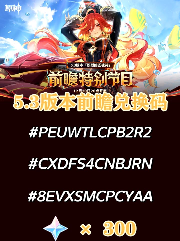 《原神》5.3版本「炽烈的还魂诗」前瞻300原石兑换码