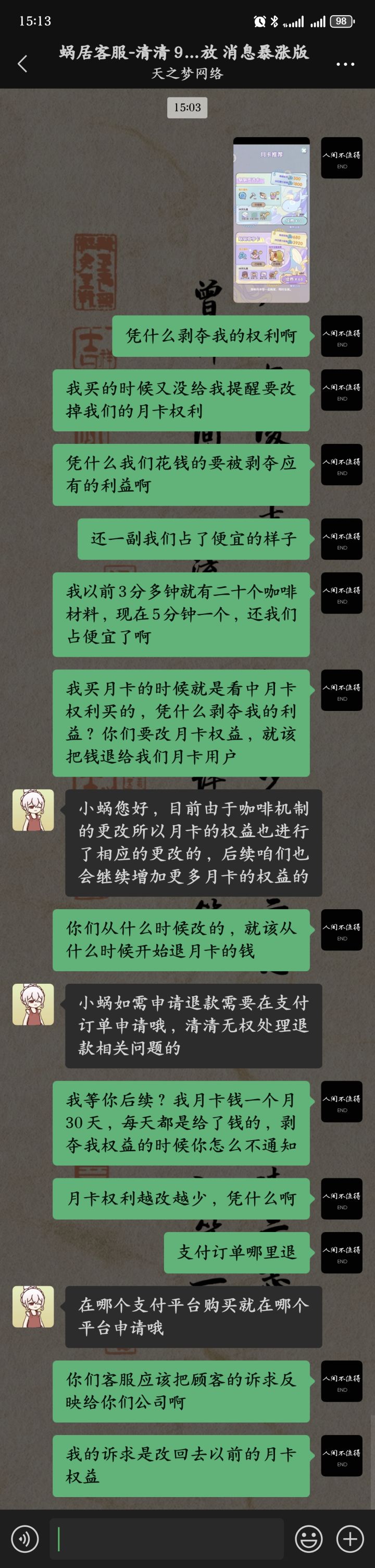 我买月卡的时候就是看中的月卡权益才买的,你们降低了我的权益,任何补偿都不给我?我是看中你五分钟一个咖啡材料才买的吗?我是看中你需要油漆材料才能改色吗?你从什么时候改的月卡权益,就该从什么时候退我钱!什么时候花钱还要被你们这么搞啊?问问你们公司员工,一个月六千的工资,从今天开始改成三千工资,剩下三千每天给你们两包零食代替,一个月凑满三千块,问你们愿不愿意?!简直是诈骗行为!#我的休闲时光 #我