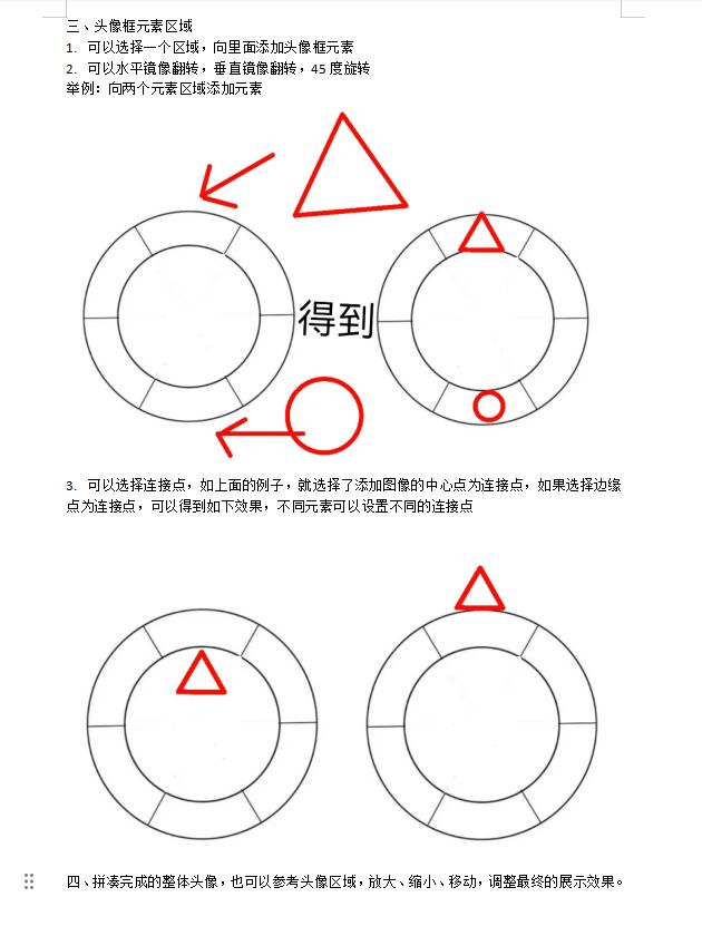 首先,头像区域,拆分成3个模块头像(1个圆形区域),头像框(1个环形区域),头像框元素(6个位置点),8个区域可独立调整层级头像区域首先,选择一个头像元素,可做如下调整,水平镜像翻转,垂直镜像翻转,45度旋转,之后确定其次,确定头像元素后,在固定的圆形展示区内调整展示效果,可放大,移动,头像元素,得到最后展示效果