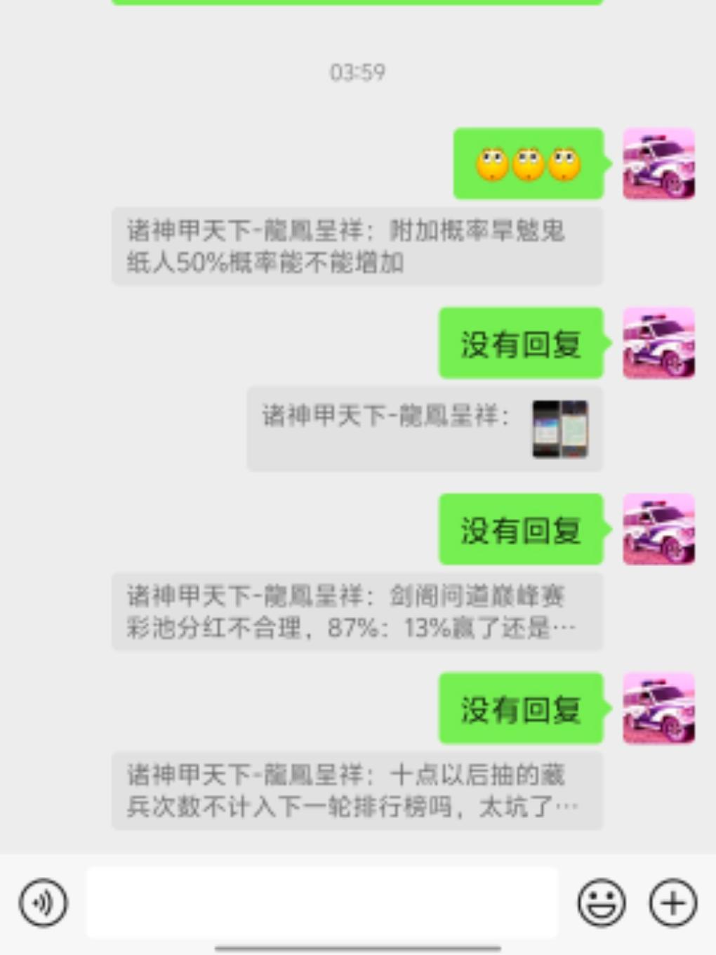 几天不给回复的客服,是又因为欠薪辞职了吗?赶紧给我换一个,氪金上万无客服服务 1.鸾凤图腾附加概率旱魃鬼纸人50%被动概率能不能增加 2.剑阁问道巅峰赛彩池分红不合理,87%:13%赢了还是翻一倍,应该至少4倍,彩池扣1-5%,其他按比例给赢得 3.十点以后抽的藏兵次数不计入下一轮排行榜吗,太坑了,昨天定榜以后我抽了几十下,能不能给提示或者给补偿#不良人破局 #游戏不良人破局 #不良人破局上 #不