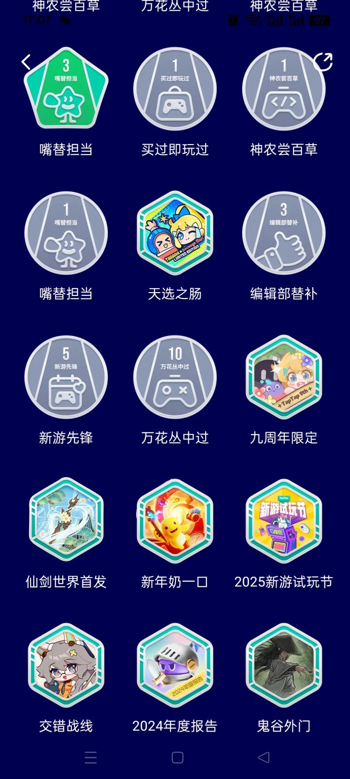 #TapTap9周年 #游戏人生九宫格 话说以前都不知道徽章和头像框这些,后面也是偶然看到大佬小虾米的帖子才知道有徽章和头像框可以领取的,然后每次有了都会第一时间领取,感觉有种收集的乐趣吧这些是我个人目前拿到的全部徽章和头像框,估计大佬们的更多,可惜以前好多都错过了呢徽章有两种,一种是可以升级的,一种是不能升级的,可以升级的徽章一般都是不限时的,只要达到了某些要求就解锁了,不能升级的徽章一般