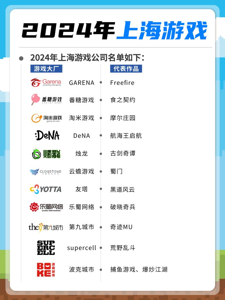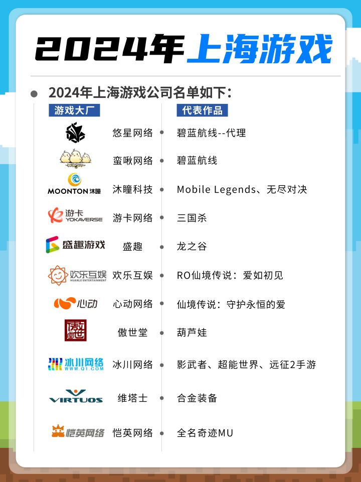(排名不分先后,欢迎大家在评论区补充指正~)为大家整理了2024年上海的游戏公司腾讯 | 代表作品《王者荣耀》《白夜极光》《和平精英》米哈游 | 代表作品《原神》《崩坏:星穹铁道》《崩坏3》网易游戏 | 代表作品《第5人格》《逆水寒》.......(正文参考全部)#游戏知识杂谈#游戏公司#游戏资讯#宝藏厂商