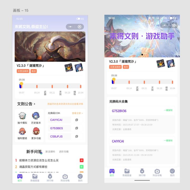 小程序上线后大家反响很不错~哈哈哈哈啊哈。所以咱立马开始构思2.0的版本啦!!!今天先出了首页的设计稿,家人们来点意见~(左:2.0 / 右:1.0)#游戏讨论#游戏助手#镇魂街:天生为王#攻略#游戏推荐