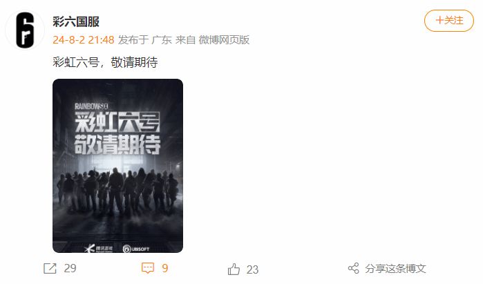 《彩虹六号》国服官方微博现已上线,发布首个动态:“彩虹六号,敬请期待 ”。真没有开玩笑吗,而且还是腾讯代理,好家伙,充钱彩6,使命召唤同款?皮肤彩6,就完事了。#今天游戏圈发生了啥 #八卦 #吃瓜杂谈 #游戏咨讯 #耿鬼鬼