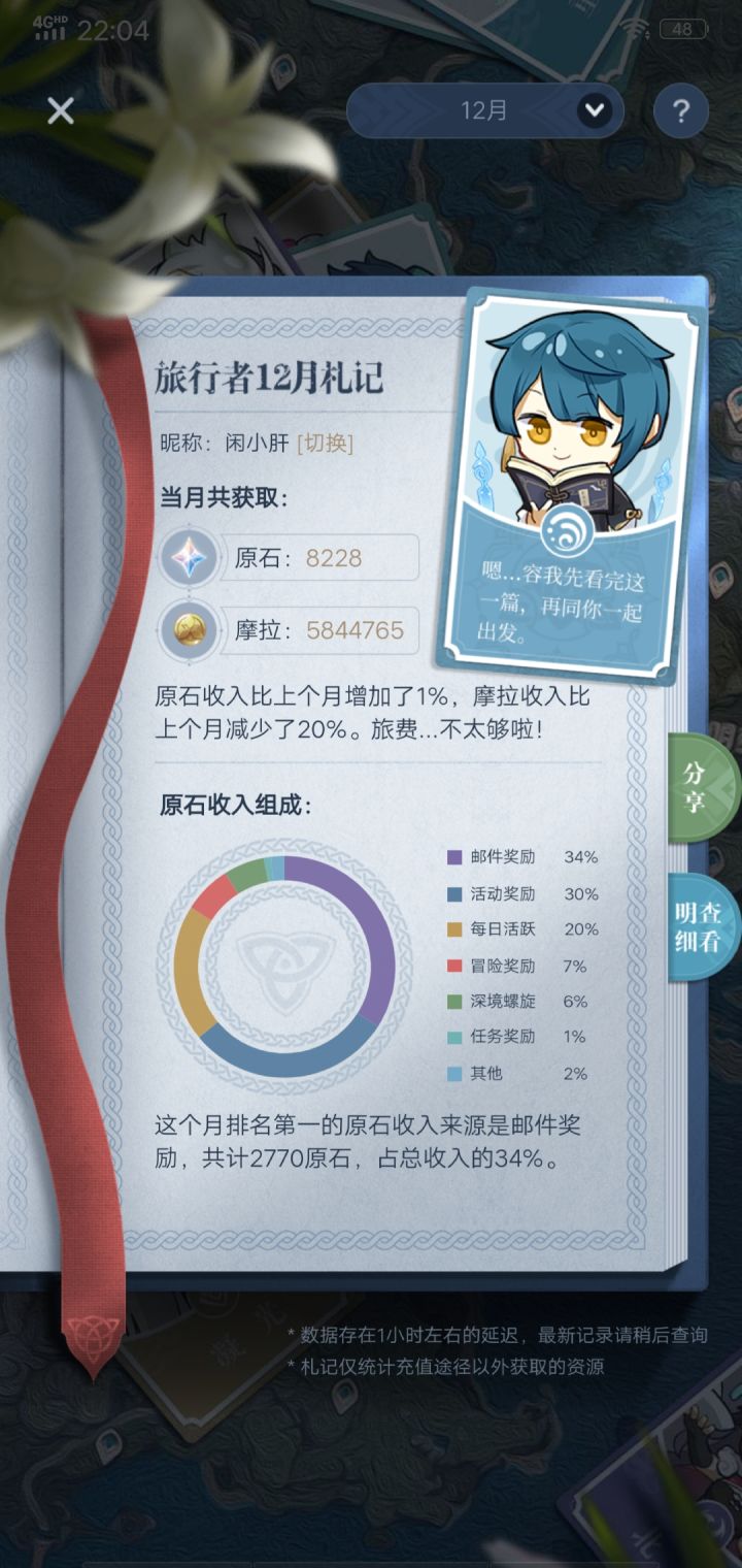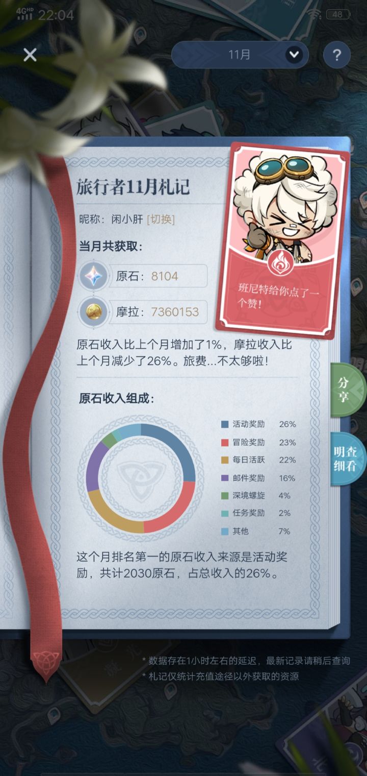 玩这么久原神了,我也算是个老玩家了。从一开始的不要命的肝,变成了我现在间歇性的断断续续地肝应该勉强可以称呼我自己一声“肝帝”吧目前每月平均收入八千多原石吧,而且是不咋肝的那种(因为图都肝完了),以前可以到一万多原石。但现在又有新图了,我得放一放再肝因为我比较喜欢白嫖所以玩游戏很少充钱,就给原神充过一次小月卡,还是我之前中奖得的128游戏基金里的钱也不是不想充,就是穷我虽为一介肝帝,