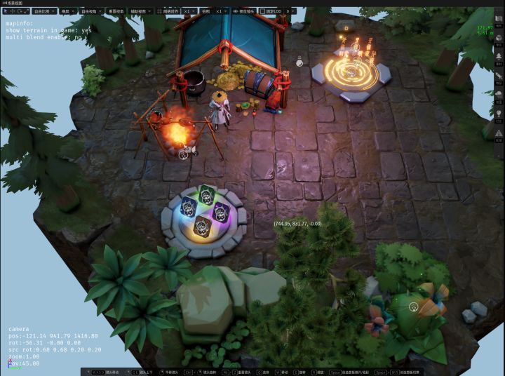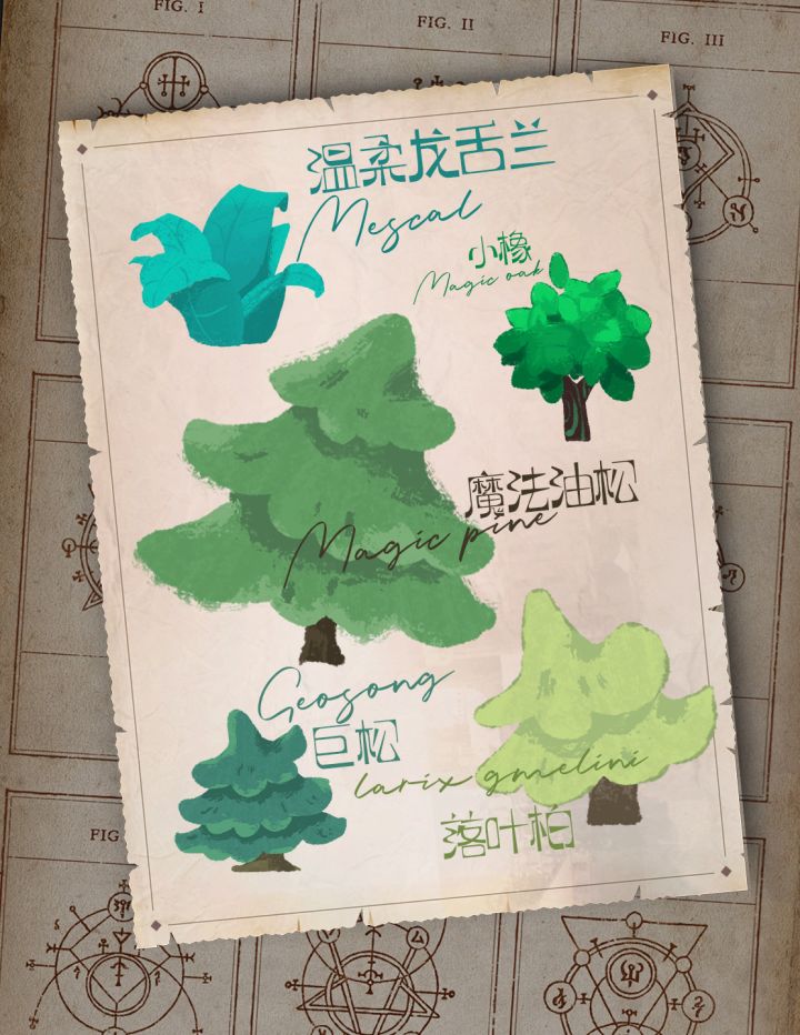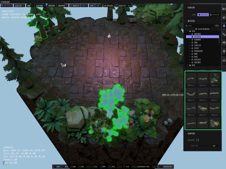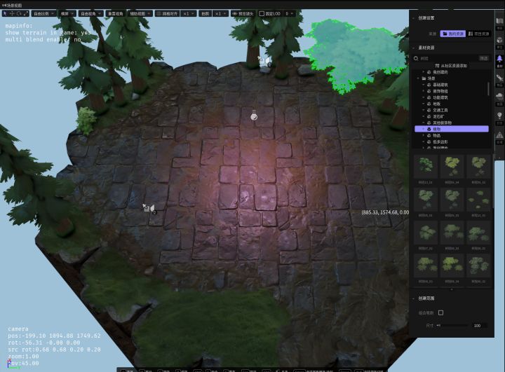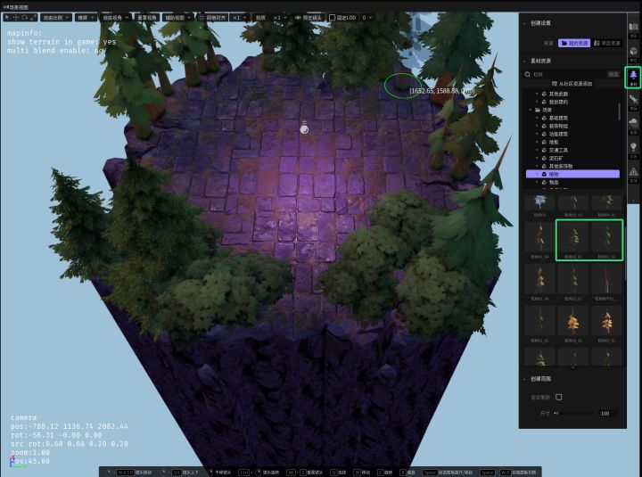 #星火编辑器 #星火编辑器入门 #游戏场景设计 我正在尝试用『星火编辑器』创作一款卡牌游戏。上一期我们已经设计了一个看上去真实且有纹理和光照的3D浮空岛,今天让我们将它完善,为这座“空岛”加上生态,形成更真实的主界面3D背景。首先我们找到编辑器右侧的素材栏,可以看到编辑器内已经有了很多预制的素材。选择【场景】中的【植物】页签,能看到有各种各样的树木,这里我们可以先试着在地图边缘搭一些松树(P