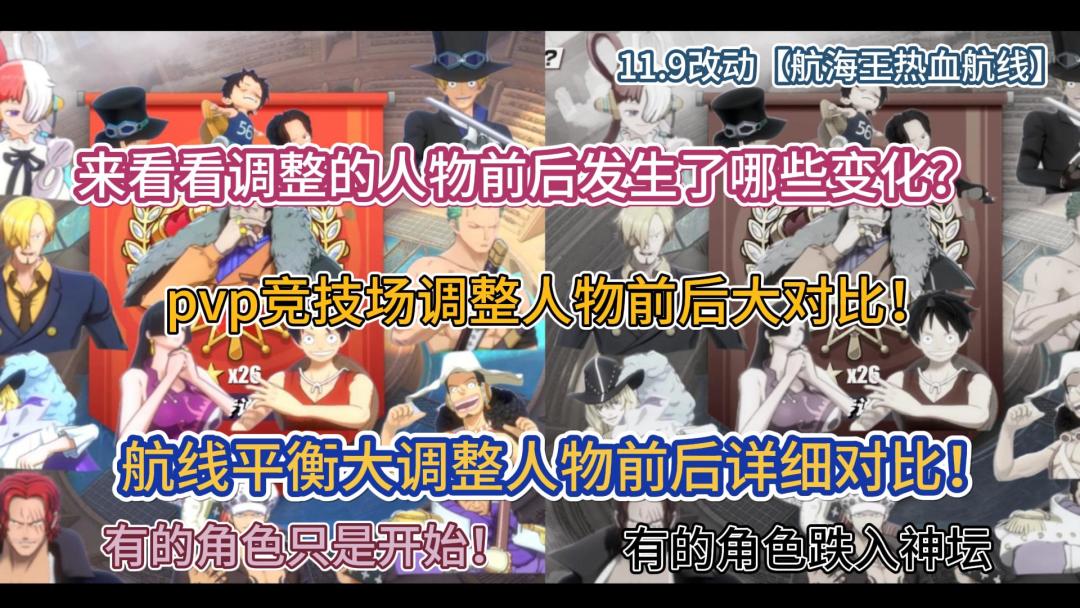 航线平衡大调整人物前后详细对比!来看看调整的人物前后发生了哪些变化?pvp竞技场调整人物前后大对比!有的角色跌入神坛,有的角色只是开始!11.9改动【航海王热血航线】