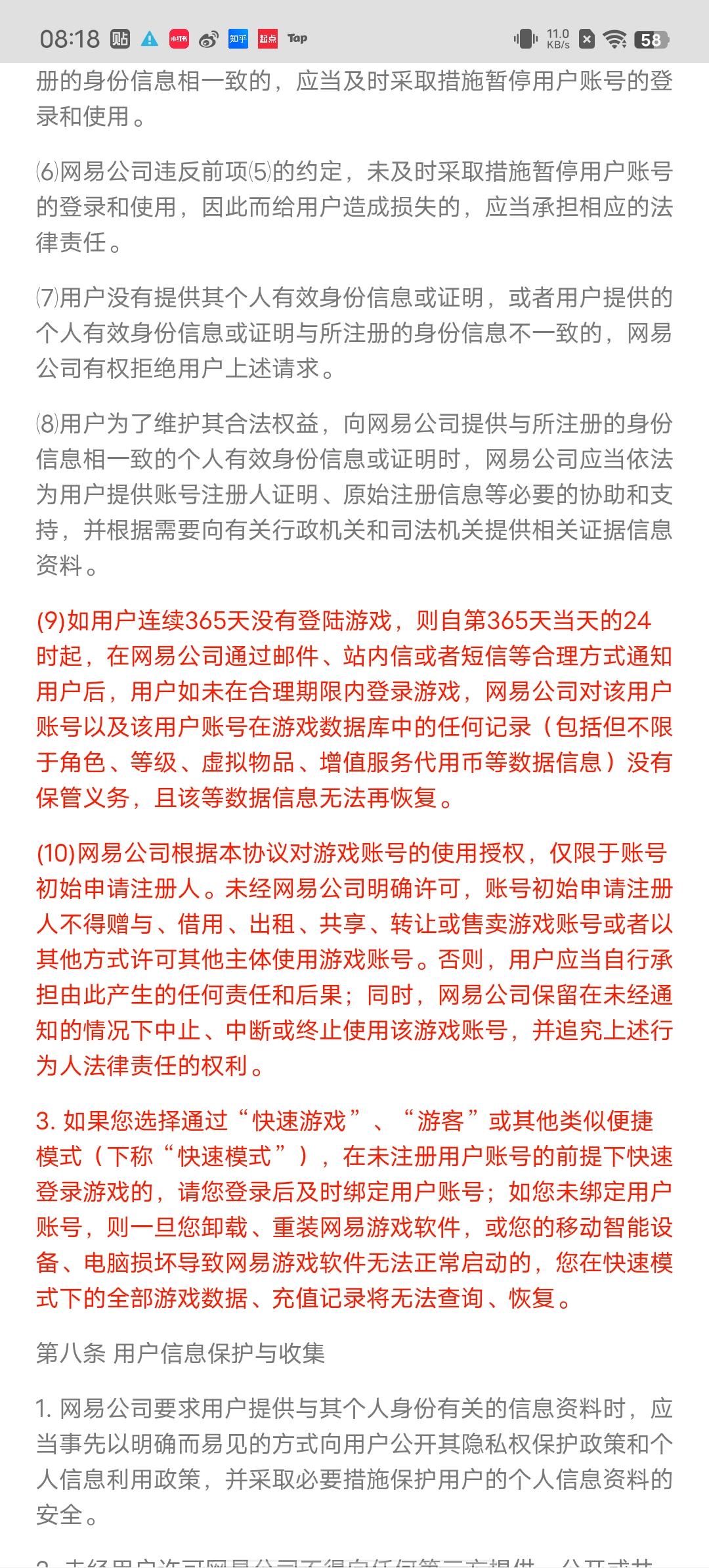 看了一下3位厂商的用户协议,米和网都是连续365未登入游戏,则删除用户游戏数据。腾是3年内未使用则删除。这要是生活忙碌,没时间玩,等到某天心血来潮看老婆的时候发现数据删除了,这心态不崩?#游戏数据