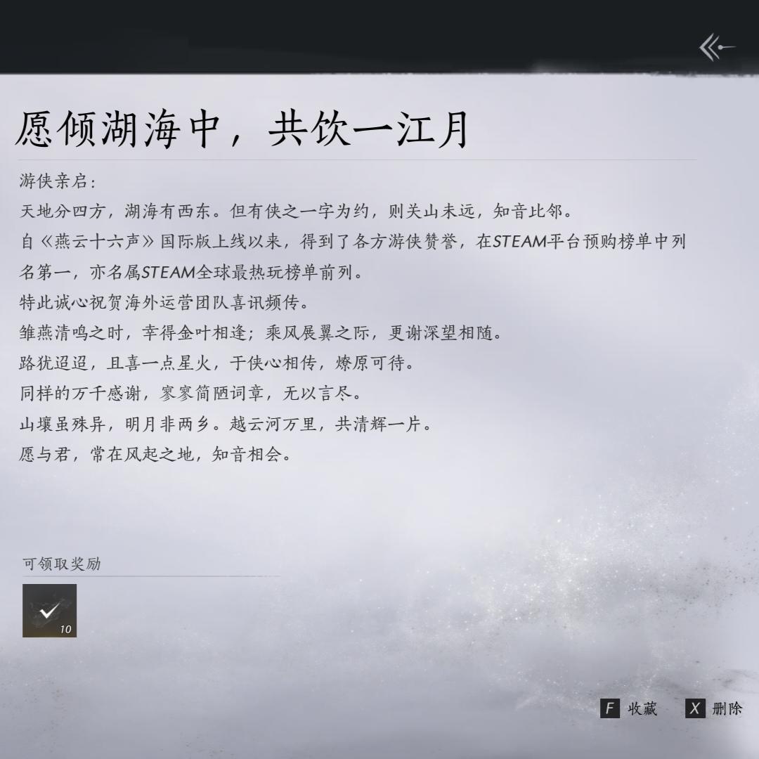 🍂“燕子文案这一块!”这次因为国际服上线以及近日反响强烈,燕子又发来两封邮件!!送了共计10抽袅袅之音+10抽绕梁之音+1115长鸣玉(折合6.96抽)+一个界碑置景!!好大方的燕!!【而且燕云这两天确实在国外蛮火的,总能刷到有外国主播在玩这个游戏,还有人专门转区去玩国际服,虽然翻译褒贬不一,但我觉得迈出这一步就已经很厉害啦!!!把武侠文化带到世界!!【是的,我玩燕云十六声。(整