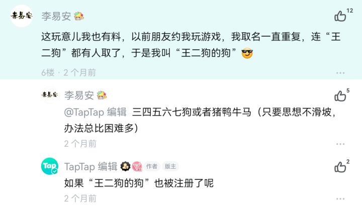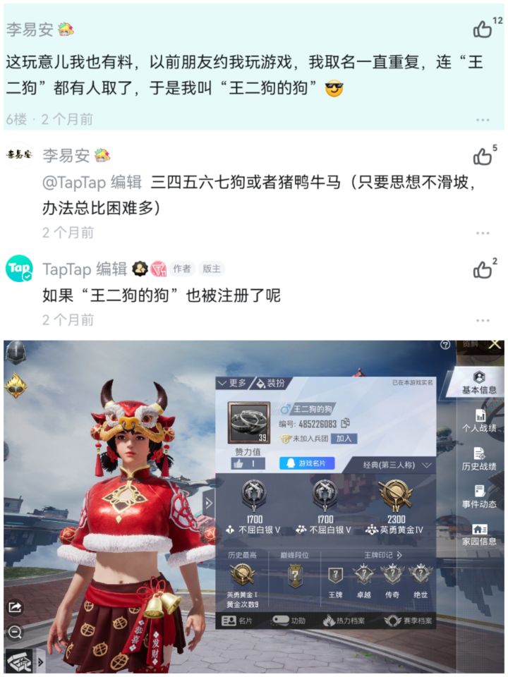 迟到的图和真相缘起:过年回家几朋友聚一起,约我打吃鸡,但他们打Q区,我以前打的V区,于是我Q区建号。想了几箩筐狂拽酷炫的名字,都显示已存在了。十几分钟过去了,大家都是体面人,虽然他们体面的没说啥,但我的体面已经不容再耗下去了,脑子一热寻思着“王二狗”这名字总没人用了吧?结果连这名都让取了!心一横,“王二狗”升级版——“王二狗的狗”诞生了#游戏昵称鉴赏会