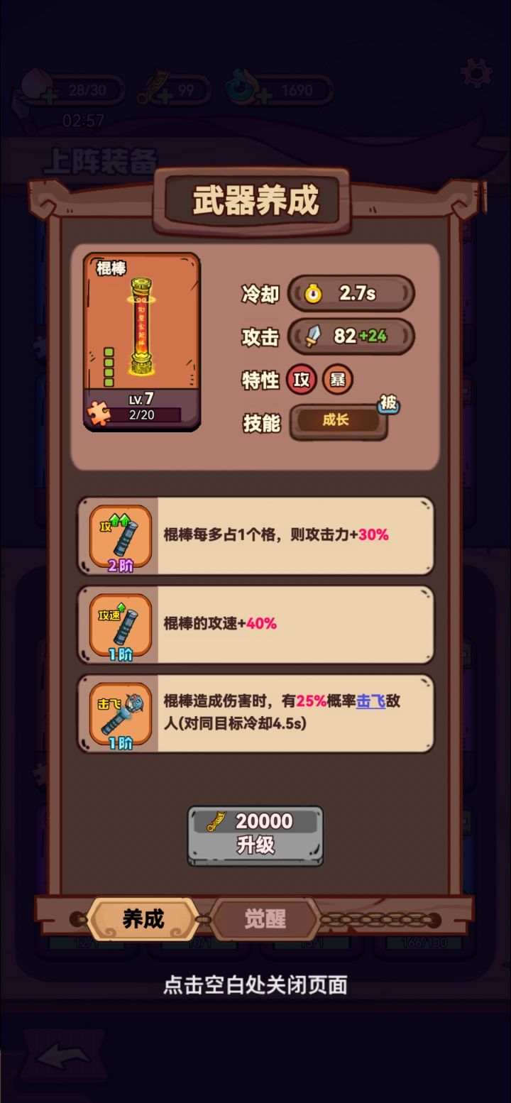 #武器请上场 #请武器上场攻略 #武器请上场攻略 #游戏目前游玩体验还不错 ,前期主升棍棒、钱包、戒指这三个就够了,每天可以看广告领取橙色武器碎片,2天基本就可以7级棍棒,随便过关卡了,有能力的小伙伴建议氪一个38永久免广告卡,就更舒服了。
