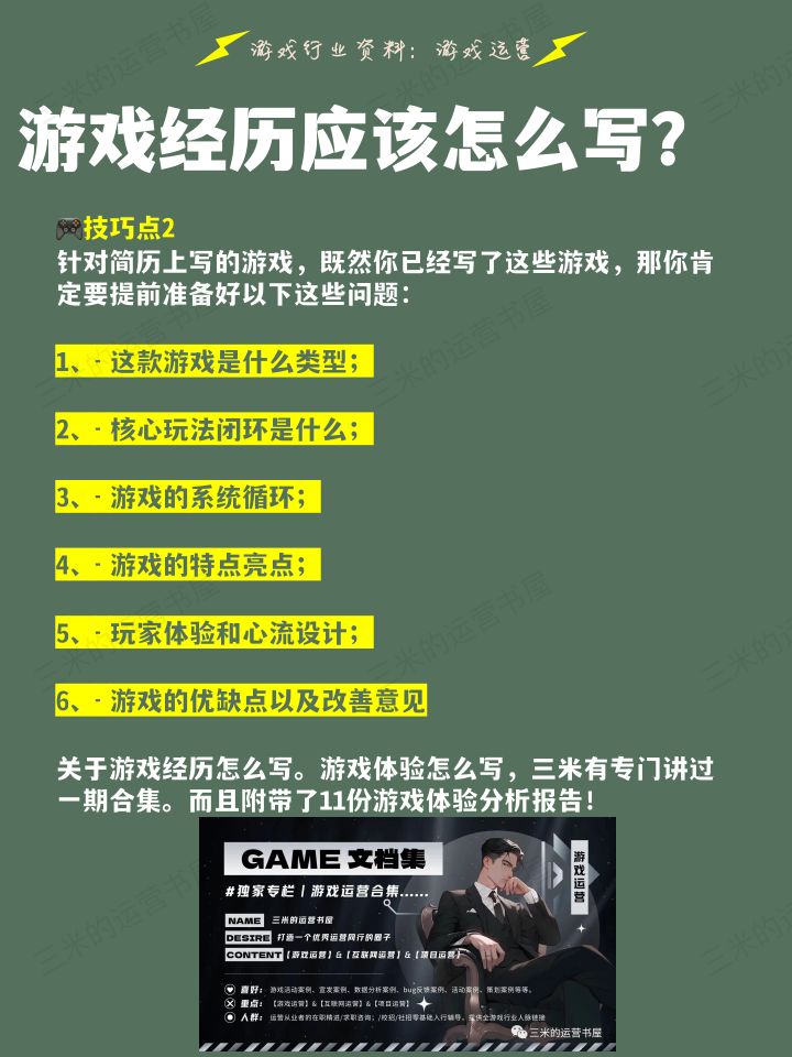 再劝一次吧。游戏经历描写的技巧2个。赶紧Mark收藏起来!简历上写的游戏经历,肯定会在面试中问道。写简历的时候就应该想象自己在面试中可能遇到的问题。技巧点1、想让面试官问你擅长的或准备好的游戏,那你写游戏经历就注意以下几点:👀不要只写游戏的名字,要写清楚游玩时长、氪金数额、游戏成就等内容。把有特殊成就的游戏写在最前。比如你xx游戏玩了几千个小时对于不同公司要有针对性。事先做好调研,清楚公