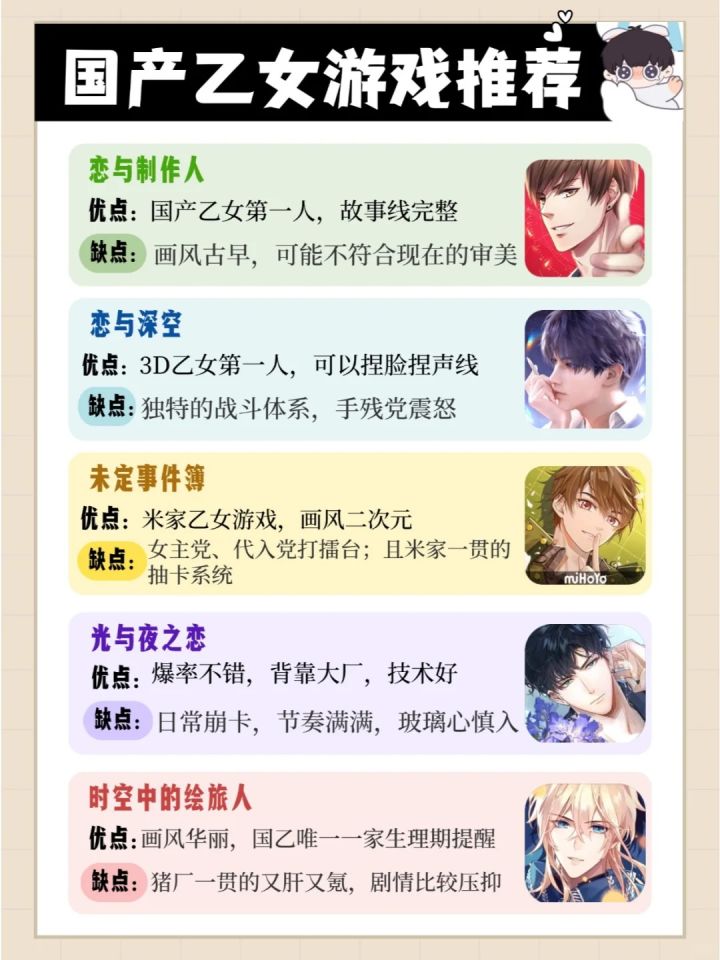 【恋与制作人】作为国产乙女游戏的开山鼻祖,它拥有完整的故事线,让你深陷其中。但画风略显古早,可能不是所有人的菜。【恋与深空】3D乙女游戏的先锋,你可以自由捏脸捏声线,打造独一无二的角色。但独特的战斗体系,可能让手残党望而却步【未定事件簿】米哈游出品,画风二次元,让你一秒入戏。但女主党和代入党的争议,以及抽卡系统,可能会让你又爱又恨。【光与夜之恋】背靠大厂,技术过硬,爆率不错。但日常崩