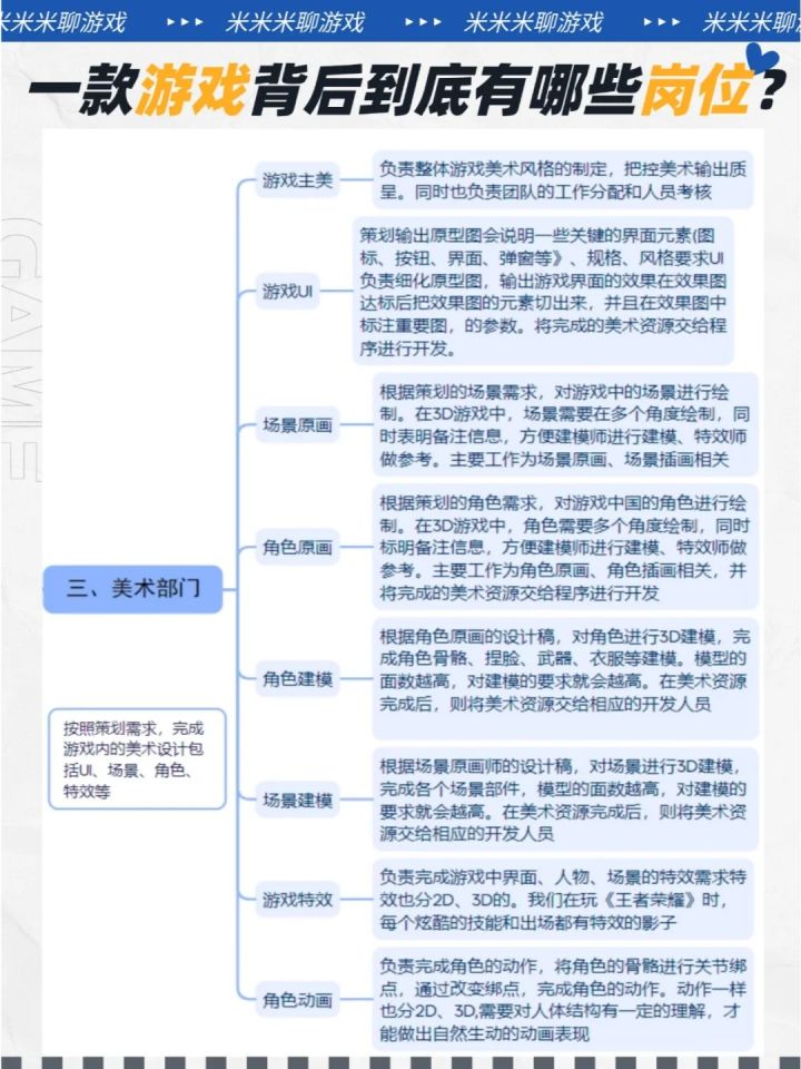 🎨 策划部门:游戏的筑梦师他们是游戏世界的构想者,包括游戏主策、系统策划、数值策划和文案策划。他们用创意和策略,打造游戏的玩法、故事和经济体系,让游戏世界既平衡又迷人。🖌️ 美术部门:视觉的魔术师由游戏主美、UI设计师、角色建模师、场景建模师、游戏特效师和角色动画师组成。他们以艺术和技术的融合,赋予游戏世界以色彩和动感,让每个角落都充满生命力。💻 程序部门:技术的工匠游戏主程、前端开