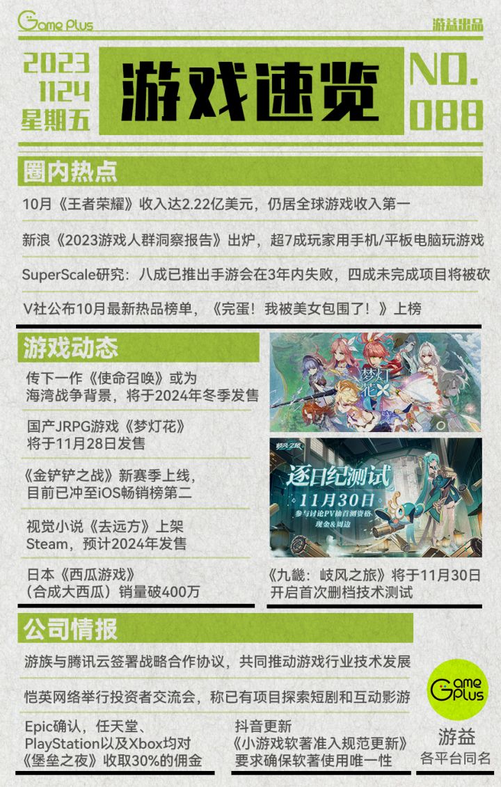 今日热点信息:10月《王者荣耀》收入达2.22亿美元;恺英网络称已有项目探索短剧和互动影游。更多内容请见图片:#游戏资讯#游戏杂谈#游戏行业#游戏公司#游益