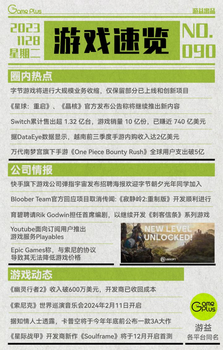 今日热点信息:字节跳动官宣大幅缩减游戏业务;任天堂Switch到明年出货量将超1.4亿台更多内容请见图片:#游戏杂谈#游戏资讯#游戏讨论#游戏公司#游益