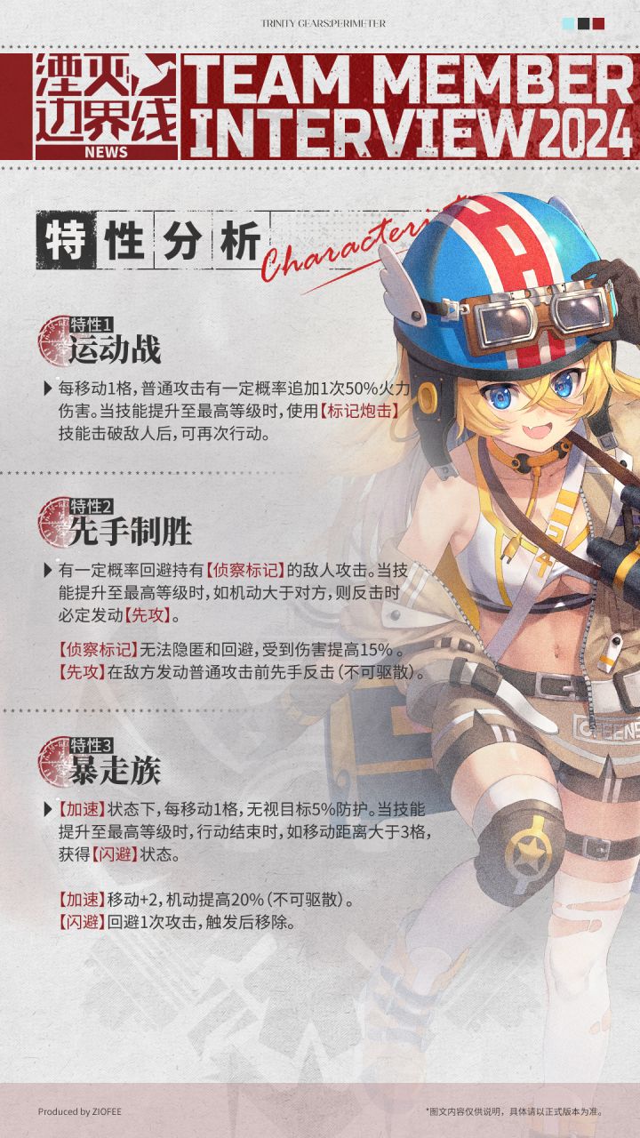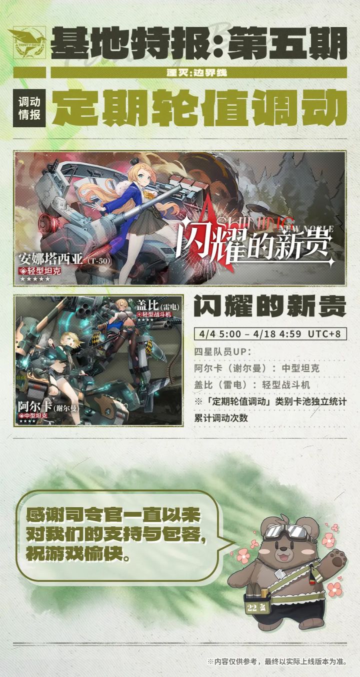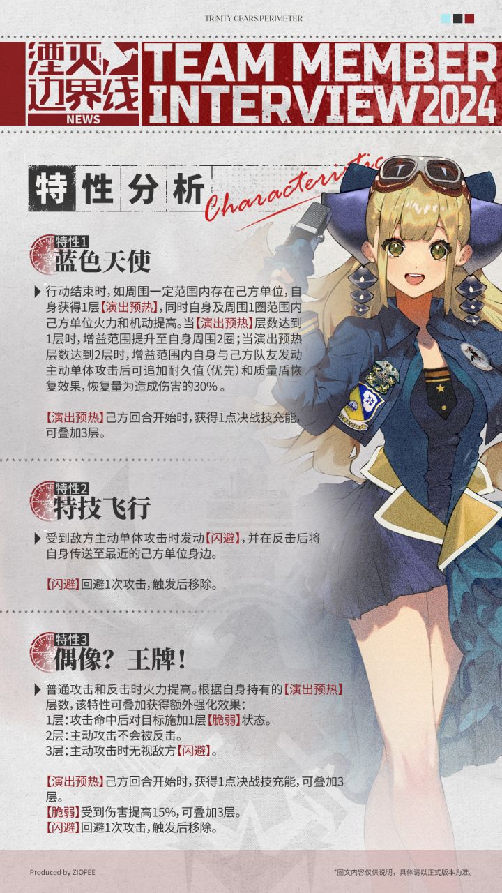 首先,热烈祝贺湮灭边界线扛住压力迎来半周年庆典。本次角色是熊猫,从开服预约里程碑就看到了,也是终于亮相了。————————————从爆料分析角色优劣表现1.特性1蓝色天使周围有队友自身获得“演出预热”,“演出预热”层数应该是1/2/3,分别对应一潜至三潜。2.特性2“闪避”应该是会增加闪避次数,这个没什么好说的。3.特性3提高火力值,根据“演出预热”的层数获得额外效果,所以还是看“演出