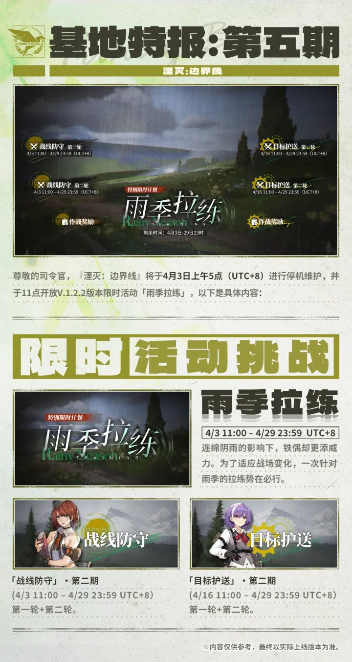 1.此次更新为限时活动!此次更新为限时活动!此次更新为限时活动!2.限时活动时间为本月,目前无限定up角色,无六分仪产出。3.T50是常驻卡池角色,不建议抽,等下个月的版本更新吧。#湮灭边界线 #湮灭边界线更新