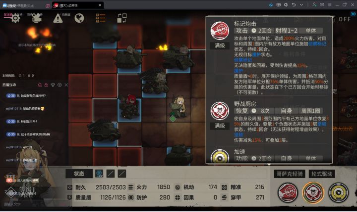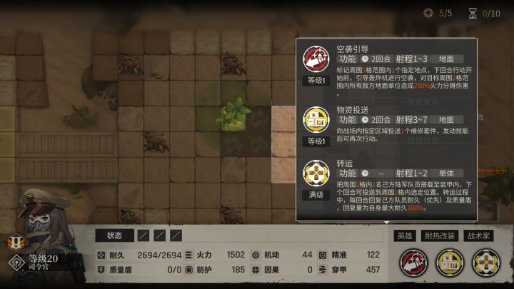 通常技和决战技纯模版技能1.通常技 标记炮击 对目标九格 加侦察 无视援护 技能倍率150/165/175/185/200%2.决战技 空袭一个大十字 技能倍率250/265/275/285/300%满级技能最高级强化特性1 每移动一格,(移动3+2)潜能概率按60/80/100算特性2 回避侦察标记敌人 潜能概率按60/80/100算特性3 一格给5%,按5/10/15算,1是2
