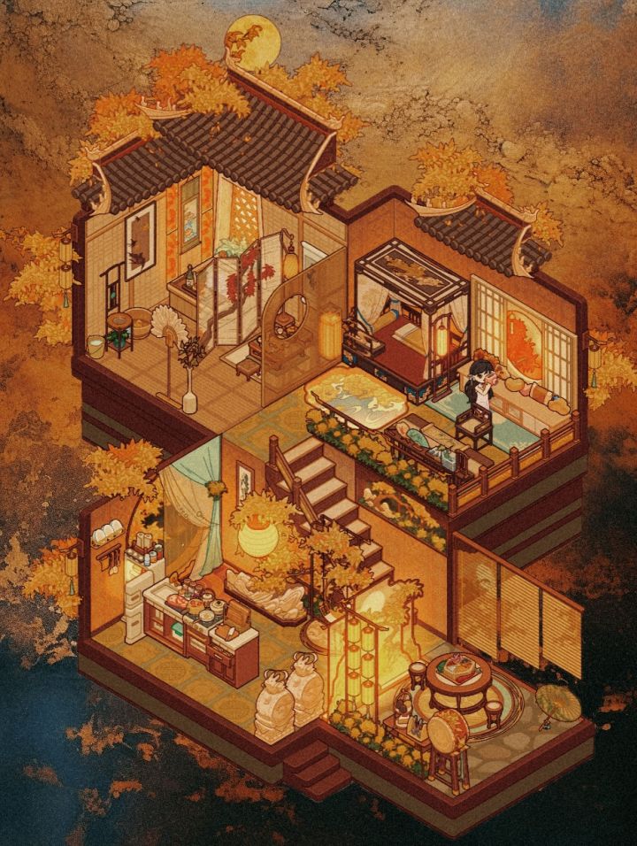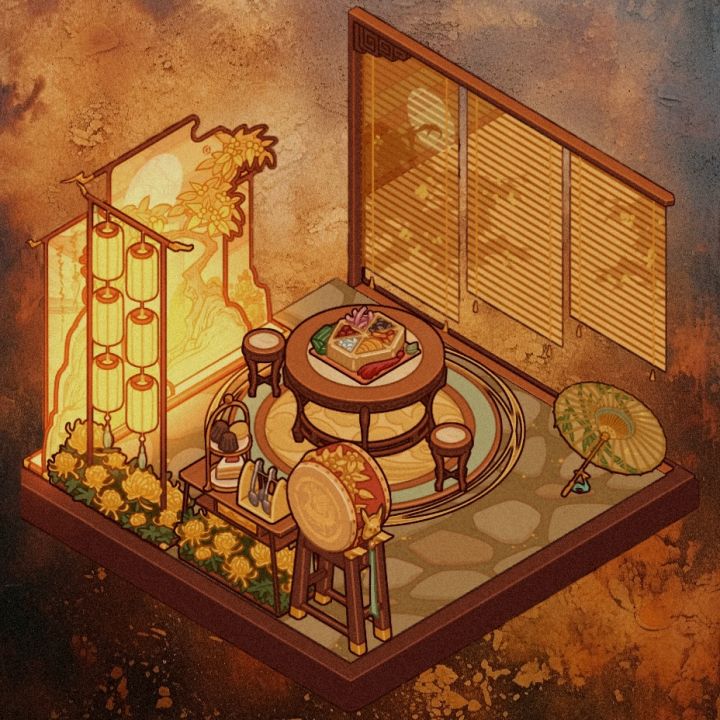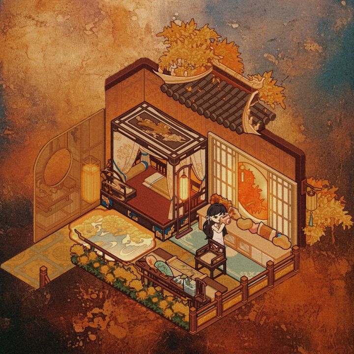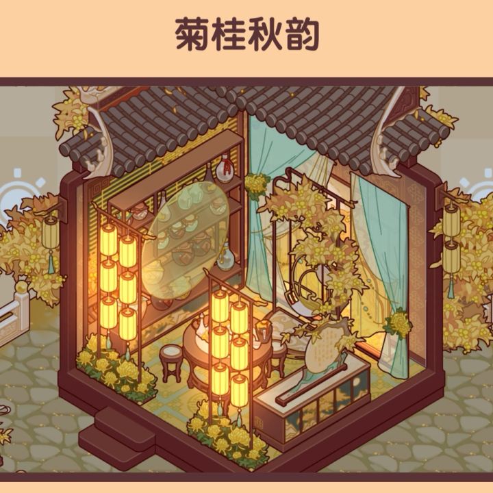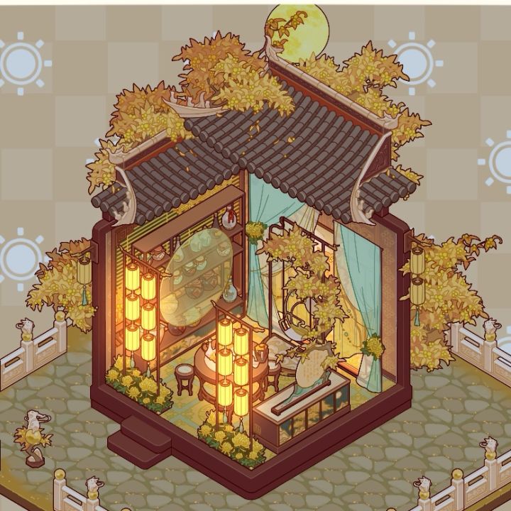 这周设计师周赛主题为菊桂秋韵,顾名思义和秋天有关,那最近的套间也就是满月了,黄色代表秋收,暖色系,我就直接用满月家具布置了,和上周的金堂满月很像,总之是投稿了!游戏ID:aUDHJNVHDjnG#我的休闲时光#我的休闲时光创作官#我的休闲时光蜗居物语#满月酒家微场景#满月酒家