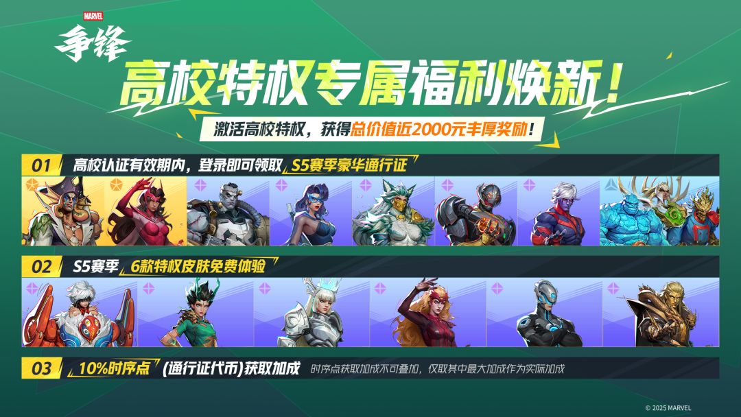 《漫威争锋》第5赛季「一心一弈」即将在11月14日正式开启,高校特权也将在版本更新后迎来焕新!各位高校玩家还没激活高校特权?快随着视频的指引激活特权吧! 高校认证有效期内,登录游戏即可直接领取第5赛季豪华通行证「天尊花园之旅」,10套精美制服及更多外观等你解锁! 凭高校特权还可在游戏内免费体验6款特权制服,并获得10%的时序点获取加成! 激活高校特权,获取海量福利,《漫威争锋》第5赛季「一心一弈」